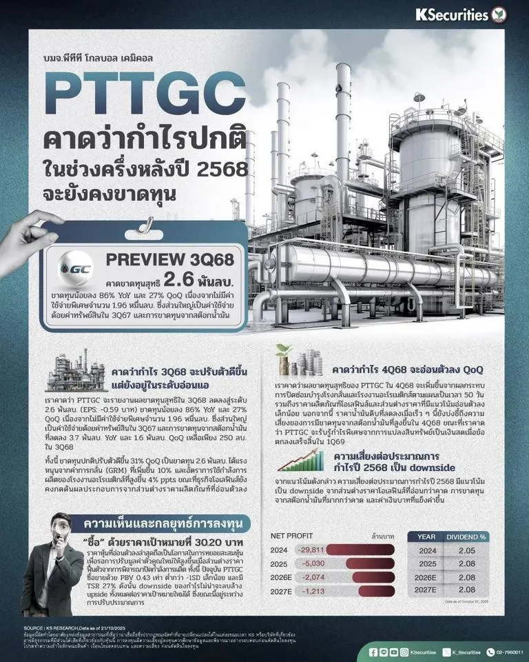 - เราคาดว่า PTTGC จะรายงานผลขาดทุนสุทธิในไตรมาส 3/2568 ลดลงสู่ระดับ 2.6 พันลบ. (EPS: -0.59 บาท) ขาดทุนน้อยลง 86% YoY และ 27% QoQ เนื่องจากไม่มีค่าใช้จ่ายพิเศษจำนวน 1.96 หมื่นลบ. ซึ่งส่วนใหญ่เป็นค่าใช้จ่ายด้อยค่าทรัพย์สินในไตรมาส 3/2567 และการขาดทุนจากสต๊อกน้ำมันที่ลดลง 3.7 พันลบ. YoY และ 1.6 พันลบ. QoQ เหลือเพียง 250 ลบ. ในไตรมาส 3/2568 ทั้งนี้ ขาดทุนปกติปรับตัวดีขึ้น 31% QoQ เป็นขาดทุน 2.6 พันลบ. ได้แรงหนุนจากค่าการกลั่น (GRM) ที่เพิ่มขึ้น 10% และอัตราการใช้กำลังการผลิตของโรงงานอะโรเมติกส์ที่สูงขึ้น 4% ppts ขณะที่ธุรกิจโอเลฟินส์ยังคงกดดันผลประกอบการจากส่วนต่างราคาผลิตภัณฑ์ที่อ่อนตัวลง