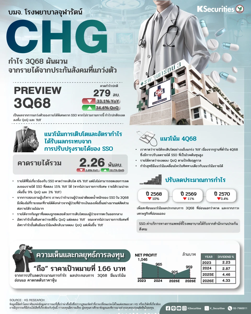 - เราคาดว่า CHG จะรายงานกำไรปกติไตรมาส 3/2568 ที่ 279 ลบ. เพิ่มขึ้น 35% QoQ เนื่องจากฐานที่ต่ำในไตรมาสก่อน แต่ลดลง 33% YoY เนื่องจากฐานสูงในปีก่อน โดย CHG มีการปรับลดรายได้จากประกันสังคม (SSO) ในไตรมาส 2/2568 ขณะที่ในไตรมาส 3/2567 บริษัทฯ มีการบันทึกรายได้พิเศษเพิ่มจาก SSO หากไม่รวมการปรับปรุงรายได้พิเศษนี้ กำไรปกติจะลดลงทั้ง QoQ และ YoY ทั้งนี้ กำไรปกติในช่วง 9 เดือนแรกของปี 2568 คาดว่าจะลดลง 18.5% YoY คิดเป็น 77% ของประมาณการกำไรทั้งปีของเรา
