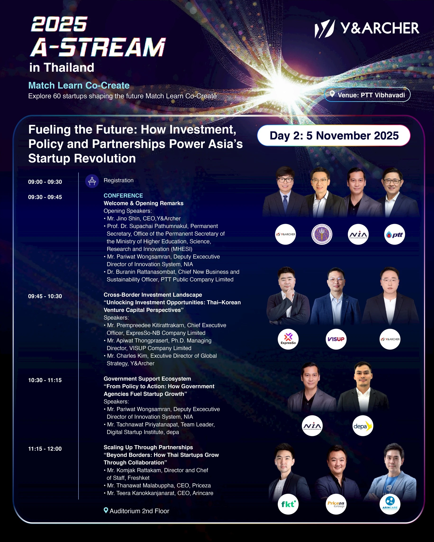 กรุงเทพฯ ประเทศไทย — Y&Archer ประกาศจัดงาน “2025 A-STREAM in Thailand” เวทีความร่วมมือเชิงกลยุทธ์ที่ออกแบบมาเพื่อเร่งการสร้างพันธมิตรด้านนวัตกรรมระหว่างองค์กรไทย นักลงทุนระดับสากล และสตาร์ทอัพเติบโตสูงจากเอเชีย กำหนดจัดในวันที่ 4-5 พฤศจิกายน 2568 ณ อาคาร ปตท. วิภาวดี กรุงเทพฯ งานนี้ถือเป็นโอกาสสำคัญสำหรับผู้นำด้านนวัตกรรมขององค์กรและนักลงทุนในการเข้าถึงโซลูชันเทคโนโลยีที่ผ่านการคัดสรรและพร้อมขยายธุรกิจ ครอบคลุมภาคส่วนสำคัญ อาทิ เทคโนโลยี ความยั่งยืน สุขภาพ และการท่องเที่ยว