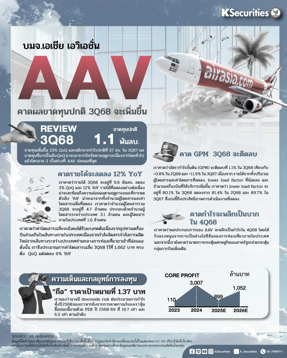 • คาด AAV จะรายงานผลขาดทุนปกติที่ 1.1 พันลบ. ในไตรมาส 3/68 ขาดทุนเพิ่มขึ้น 33% QoQ และพลิกจากกำไรปกติที่ 57 ลบ. ในไตรมาส 3/67