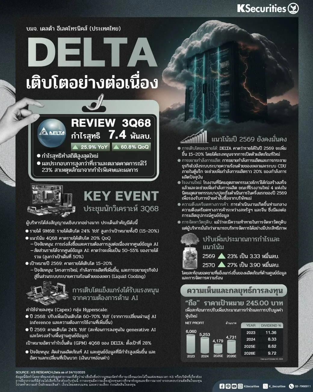 - เหตุการณ์สำคัญ เราเข้าร่วมการประชุมนักวิเคราะห์ไตรมาส 3/2568 ของ DELTA ซึ่งผู้บริหารได้ส่งสัญญาณเชิงบวกอย่างมาก บริษัทฯ รายงานรายได้ 9 เดือนแรกของปี 2568 เติบโต 24% YoY ซึ่งสูงกว่าเป้าหมายทั้งปีที่ตั้งไว้ที่ 15–20% สำหรับไตรมาส 4/2568 DELTA ให้แนวโน้มรายได้เติบโต 20% QoQ หนุนจากการเร่งสั่งซื้อและความต้องการที่แข็งแกร่งอย่างต่อเนื่องจากศูนย์ข้อมูลที่ขับเคลื่อนด้วย AI ซึ่งปัจจุบันคาดว่าจะมีสัดส่วน 50–55% ของรายได้รวม สูงกว่าเป้าหมายเดิมที่ตั้งไว้ 50% ภายในสิ้นปี สำหรับปี 2569 DELTA คาดว่ารายได้จะเติบโต 15–20% ได้แรงหนุนจากโครงการใหม่ กำลังการผลิตที่เพิ่มขึ้น และการขยายธุรกิจเข้าสู่ชิ้นส่วนระบบระบายความร้อนด้วยของเหลว