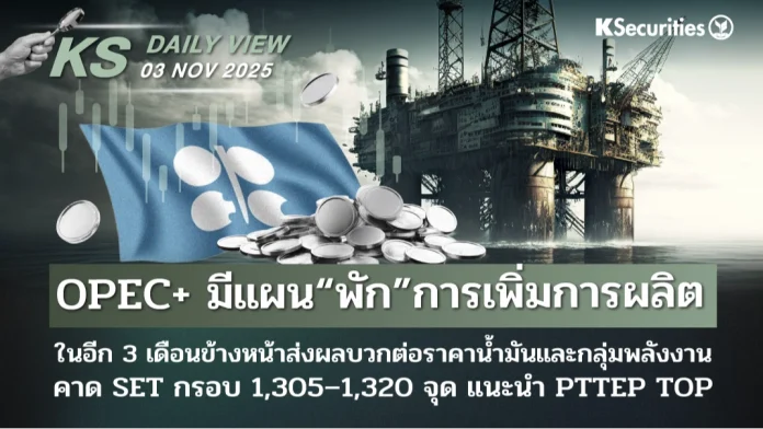 KS Daily View 03.11.2025 >>> OPEC+ มีแผน“พัก”การเพิ่มการผลิต ในอีก 3 เดือนข้างหน้าส่งผลบวกต่อราคาน้ำมันและกลุ่มพลังงาน คาด SET กรอบ 1,305–1,320 จุด แนะนำ PTTEP TOP