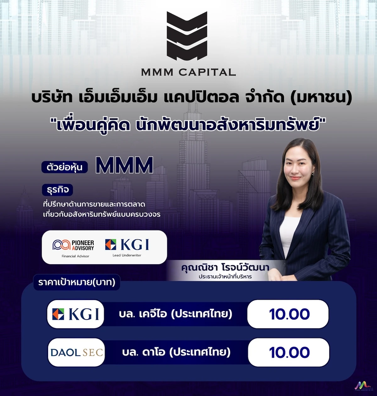 บมจ.เอ็มเอ็มเอ็ม แคปปิตอล “MMM” ประกาศตอกย้ำ Business Model ในการเป็น “โบรกเกอร์ อสังหาริมทรัพย์”แบบครบวงจร ภายใต้จุดเด่นในการวางตำแหน่งของบริษัทฯ เป็น “มินิมาร์ทอสังหาริมทรัพย์” พร้อมนำร่องรายแรกจากตลาด LiVEx สู่ตลาดหลักทรัพย์ mai เล็ง ระดมทุนขยายพอร์ตธุรกิจ 3 BU เร่งต่อยอดการเติบโตในอนาคต ด้าน บล.เคจีไอ –บล.ดาโอ สแกนหุ้น น้องใหม่ “MMM” เคาะราคาเป้าหมาย 10.00 บาท/หุ้น