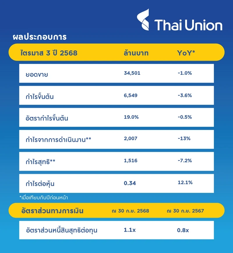 ไทยยูเนี่ยน โกยรายได้ไตรมาส 3/2568 แตะ 3.4 หมื่นลบ. รับกำไรสุทธิปรับปรุง 1,516 ลบ. ดันกำไรต่อหุ้นขยายตัว 12.1% สะท้อนความสามารถในการทำกำไรของบริษัทสดใส