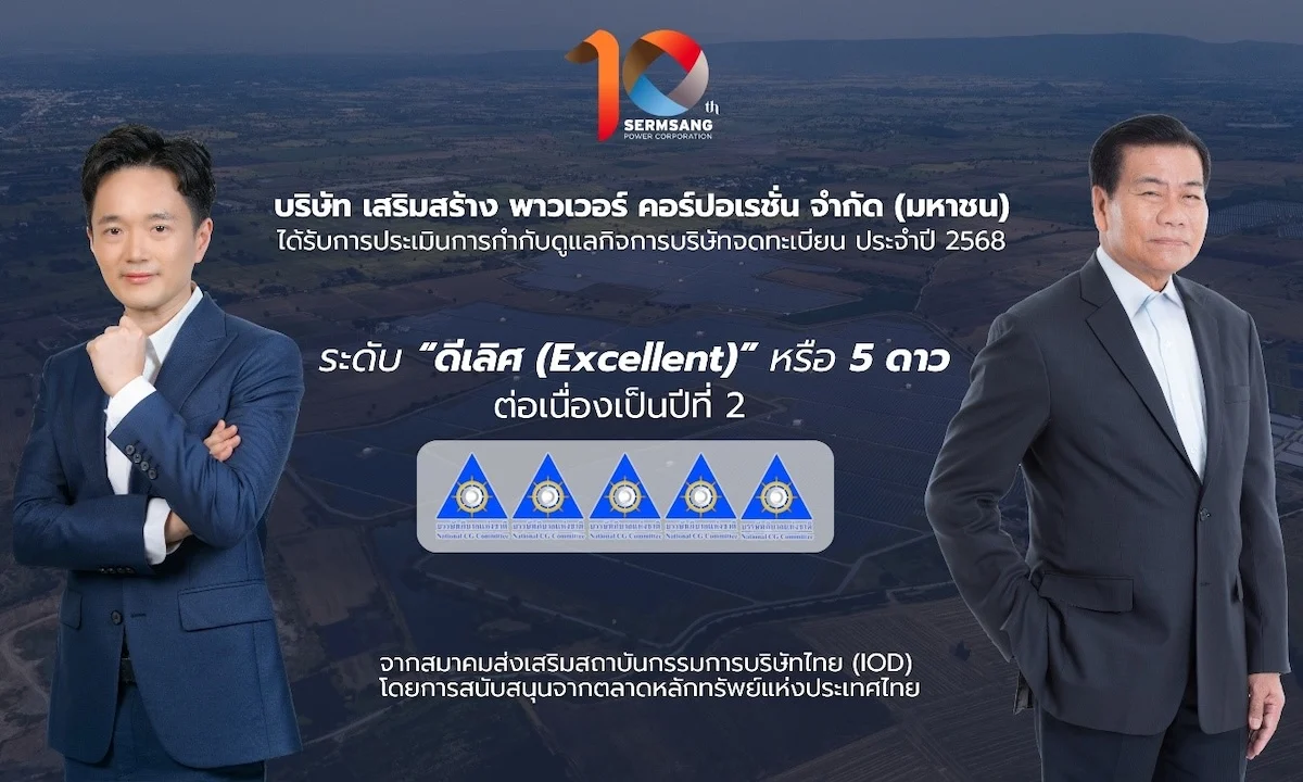 บมจ.เสริมสร้าง พาวเวอร์ คอร์ปอเรชั่น หรือ (SSP) ตอกย้ำผู้ผลิตพลังงานหมุนเวียนชั้นนำในเอเชีย ได้รับคะแนนการประเมินการกำกับดูแลกิจการในระดับ 5 ดาว หรือ “ดีเลิศ” (Excellent CG Scoring) 2 ปีซ้อน จากโครงการสำรวจด้านการกำกับดูแลกิจการของบริษัทจดทะเบียนไทย ประจำปี 2568 (Corporate Governance Report of Thai Listed Companies 2025 : CGR) จากสมาคมส่งเสริมสถาบันกรรมการบริษัทไทย (IOD) โดยการสนับสนุนจากตลาดหลักทรัพย์แห่งประเทศไทย และสำนักงานคณะกรรมการกำกับหลักทรัพย์และตลาดหลักทรัพย์ (ก.ล.ต.) สะท้อนถึงศักยภาพในการดำเนินธุรกิจของกลุ่มบริษัท ที่พัฒนามาตรฐานการกำกับดูแลกิจการมาอย่างต่อเนื่อง ครอบคลุมในทุกมิติเศรษฐกิจ สังคม และสิ่งแวดล้อม (ESG) สู่การเป็นผู้นำในด้านพลังงานสีเขียวในทุกรูปแบบ พร้อมสร้างการเติบโตอย่างแข็งแกร่งและยั่งยืนในระยะยาว