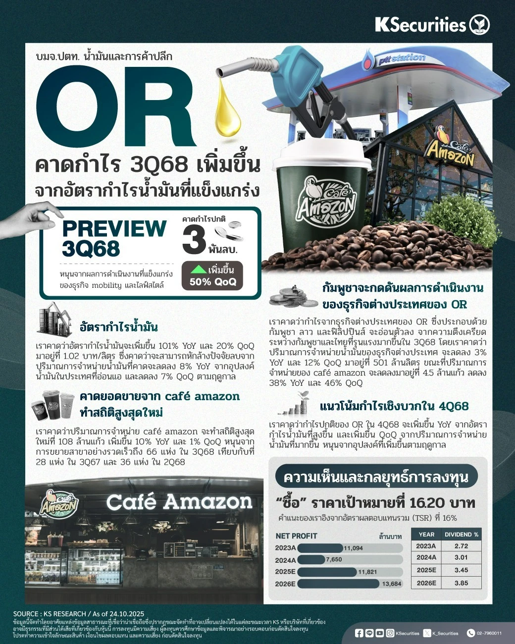 OR คาดกำไร 3Q68 เพิ่มขึ้นจากอัตรากำไรน้ำมันที่แข็งแกร่
