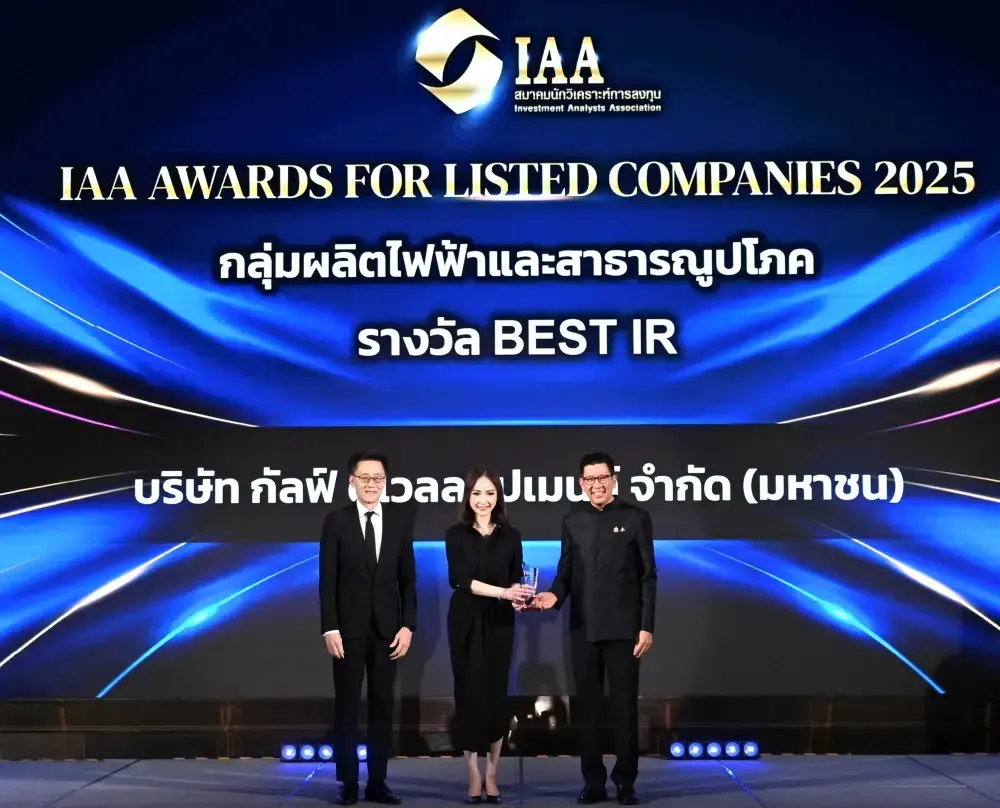 บริษัท กัลฟ์ ดีเวลลอปเมนท์ จำกัด (มหาชน) (GULF) คว้า 3 รางวัลยอดเยี่ยมในกลุ่มผลิตไฟฟ้าและสาธารณูปโภค จากเวที IAA Awards for Listed Companies 2025 ประกอบด้วย รางวัล BEST CEO ที่มอบให้นายสารัชถ์ รัตนาวะดี ประธานเจ้าหน้าที่บริหาร รางวัล BEST CFO ให้แก่นางสาวยุพาพิน วังวิวัฒน์ ประธานเจ้าหน้าที่บริหารด้านการเงิน รวมถึงรางวัล BEST IR มอบแก่บริษัทในฐานะองค์กรนักลงทุนสัมพันธ์ยอดเยี่ยม สะท้อนศักยภาพผู้บริหารในตลาดทุนที่มีศักยภาพโดดเด่น ความเป็นเลิศในการบริหารงาน และสะท้อนมาตรฐานความเป็นเลิศในการให้ข้อมูลทางการเงินที่ถูกต้อง ครบถ้วน และทันท่วงที เพื่อให้นักลงทุนเห็นศักยภาพการเติบโตขององค์กรที่ขับเคลื่อนควบคู่ไปกับกลยุทธ์ด้านความยั่งยืน ซึ่งนับว่าเป็นส่วนสำคัญอย่างยิ่งต่อการเติบโตของเศรษฐกิจตลาดทุน และประเทศไทย