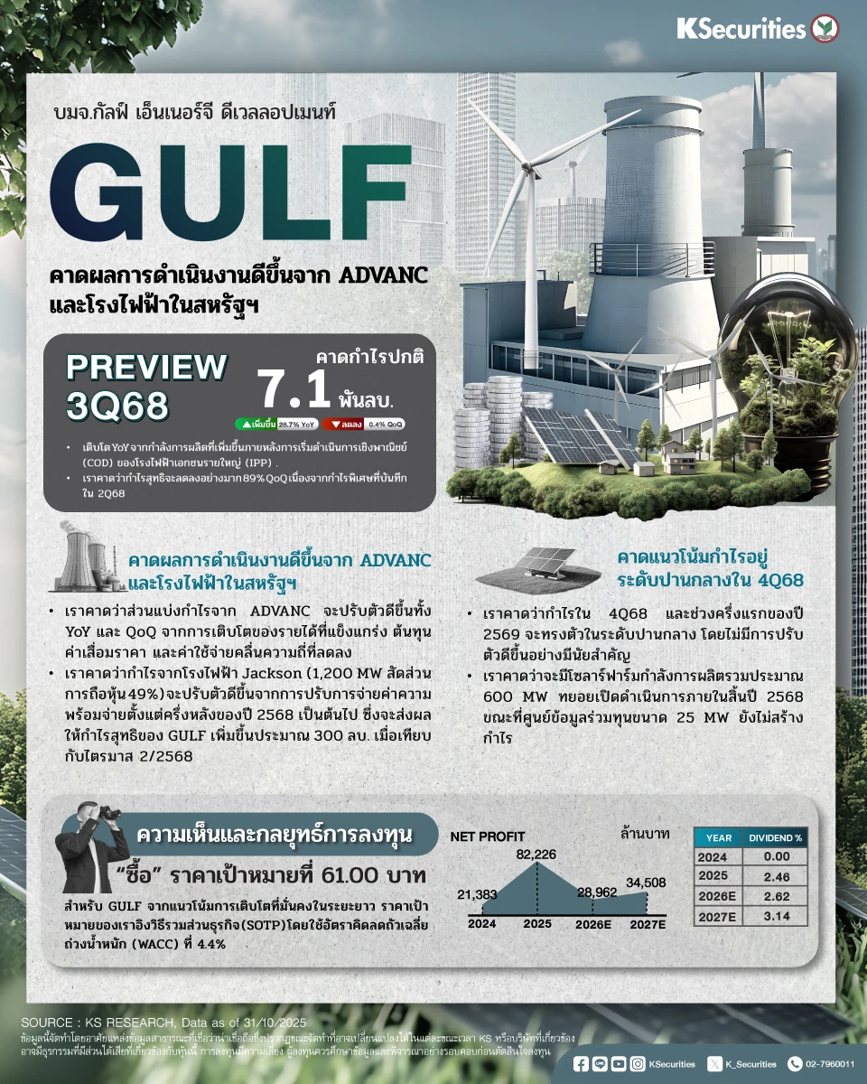 - คาดผลการดำเนินงานดีขึ้นจาก ADVANC และโรงไฟฟ้าในสหรัฐฯ เราคาดว่าส่วนแบ่งกำไรจาก ADVANC จะปรับตัวดีขึ้นทั้ง YoY และ QoQ จากการเติบโตของรายได้ที่แข็งแกร่ง ต้นทุนค่าเสื่อมราคา และค่าใช้จ่ายคลื่นความถี่ที่ลดลง นอกจากนี้ เราคาดว่ากำไรจากโรงไฟฟ้า Jackson (1,200 MW สัดส่วนการถือหุ้น 49%) จะปรับตัวดีขึ้นจากการปรับการจ่ายค่าความพร้อมจ่ายตั้งแต่ครึ่งหลังของปี 2568 เป็นต้นไป ซึ่งจะส่งผลให้กำไรสุทธิของ GULF เพิ่มขึ้นประมาณ 300 ลบ. เมื่อเทียบกับไตรมาส 2/2568