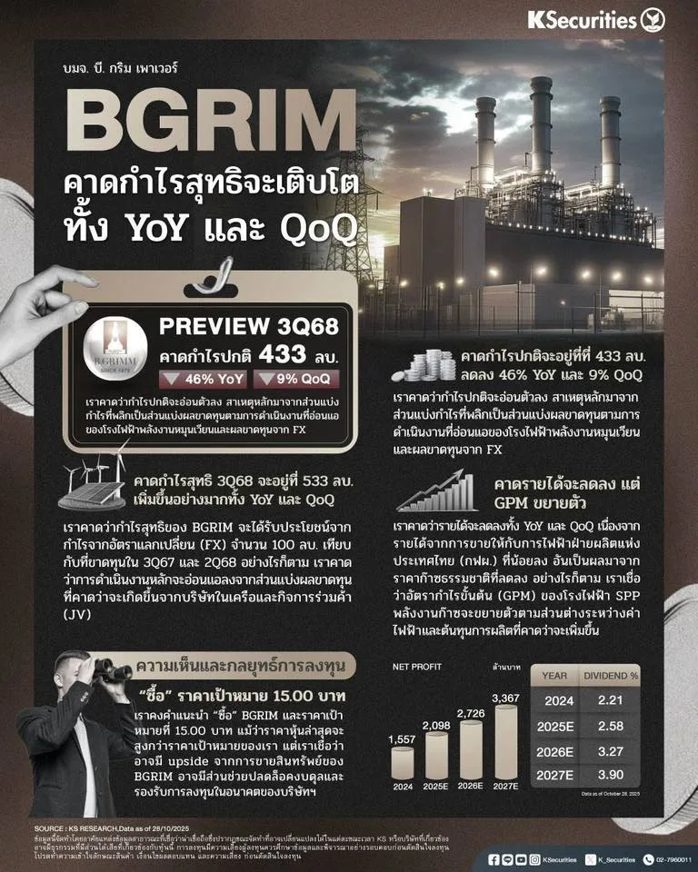 - คาดกำไรสุทธิไตรมาส 3/2568 จะอยู่ที่ 533 ลบ. เพิ่มขึ้นอย่างมากทั้ง YoY และ QoQ เราคาดว่ากำไรสุทธิของ BGRIM จะได้รับประโยชน์จากกำไรจากอัตราแลกเปลี่ยน (FX) จำนวน 100 ลบ. เทียบกับที่ขาดทุนในไตรมาส 3/2567 และไตรมาส 2/2568 อย่างไรก็ตาม เราคาดว่าการดำเนินงานหลักจะอ่อนแอลงจากส่วนแบ่งผลขาดทุนที่คาดว่าจะเกิดขึ้นจากบริษัทในเครือและกิจการร่วมค้า (JV)