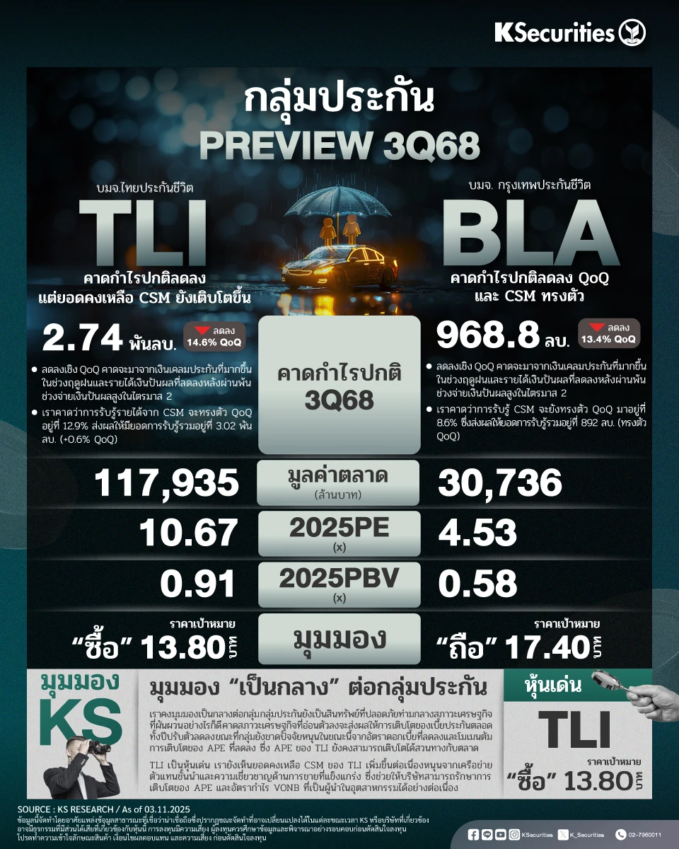 • ในส่วนของ CSM เราคาดว่ายอดคงเหลือของ CSM ของ BLA จะลดลงมาอยู่ที่ 4.04 หมื่นลบ. (ทรงตัว QoQ และ -1.1% YTD) เราคาดว่า CSM ของธุรกิจใหม่จะอยู่ที่ 566 ลบ. ลดลง 12% QoQ สอดคล้องกับ APE ที่ลดลงตามการรายงานของ TLAA ในเดือนส.ค. และก.ย.2568 ขณะเดียวกัน เราคาดว่าการรับรู้ CSM จะยังทรงตัว QoQ มาอยู่ที่ 8.6% ซึ่งส่งผลให้ยอดการรับรู้รวมอยู่ที่ 892 ลบ. (ทรงตัว QoQ)