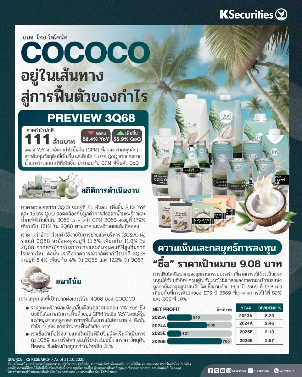 - COCOCO มีกำหนดรายงานงบการเงินไตรมาส 3/2568 ในวันที่ 11 พ.ย. เราคาดว่ากำไรปกติจะอยู่ที่ 111 ลบ. ลดลง 52.4% YoY จากอัตรากำไรขั้นต้น (GPM) ที่ลดลง สาเหตุหลักมาจากต้นทุนวัตถุดิบที่เพิ่มขึ้น แต่เติบโต 55.9% QoQ จากยอดขายน้ำมะพร้าวและกะทิที่เพิ่มขึ้น