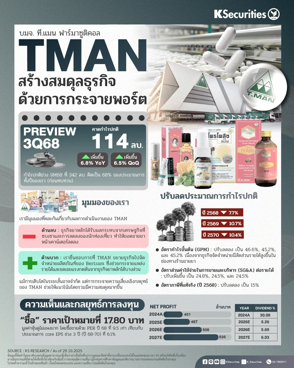 • เรามีมุมมองที่คละกันเกี่ยวกับผลการดำเนินงานของ TMAN ในด้านลบ ธุรกิจยาหลักกำลังเผชิญกับแรงกดดันจากภาวะเศรษฐกิจมหภาคที่อ่อนแอและการลดลงของจำนวนนักท่องเที่ยว ซึ่งส่งผลกระทบต่อการบริโภคโดยรวมและยอดขายยาที่จำหน่ายหน้าเคาน์เตอร์ ในด้านบวก เราชอบการขยายธุรกิจไปสู่การจัดจำหน่ายผ่านผลิตภัณฑ์ของ Bertram ซึ่งช่วยเพิ่มความหลากหลายให้กับแหล่งรายได้และช่วยชดเชยแรงกดดันจากธุรกิจยาหลักได้บางส่วน โดยรวมแล้ว แม้ว่าการเติบโตในระยะสั้นอาจมีข้อจำกัด แต่การกระจายความเสี่ยงเชิงกลยุทธ์ของ TMAN สนับสนุนแนวโน้มที่สมดุลมากขึ้น