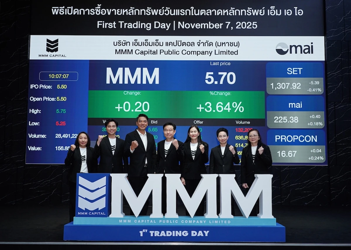 นางสาวณิชา โรจน์วัฒนา ประธานเจ้าหน้าที่บริหาร บมจ.เอ็มเอ็มเอ็ม แคปปิตอล หรือ MMM เปิดเผยว่า วันนี้ (7 พ.ย.68) บริษัทฯ ได้นำหุ้น MMM เข้าซื้อขายในตลาดหลักทรัพย์เอ็ม เอ ไอ เป็นวันแรก หลังจากที่บริษัทฯ ได้มีการเสนอขายหุ้นสามัญให้กับประชาชนทั่วไป (PO) จำนวน 64.2 ล้านหุ้น ในราคาหุ้นละ 5.50 บาท ระหว่างวันที่ 28 – 30 ตุลาคม 2568 ที่ผ่านมา ซึ่งได้การตอบรับที่ดีจากนักลงทุน สะท้อนความเชื่อมั่นในพื้นฐานทางธุรกิจที่แข็งแกร่ง และศักยภาพการเติบโตในอนาคต สู่การเป็นผู้นำในด้านการเป็นผู้ให้บริการด้านตัวแทนการขายอสังหาริมทรัพย์อย่างครบวงจรตามวิสัยทัศน์ที่วางไว้ ควบคู่กับการสร้างการเติบโตอย่างยั่งยืน และสร้างผลตอบแทนที่ดีให้กับผู้ถือหุ้น ที่สำคัญ MMM ถือได้ว่าเป็นบริษัทนายหน้าอสังหาริมทรัพย์ ที่ดำเนินธุรกิจเป็นตัวแทนขายที่อยู่อาศัยประเภทบ้าน และ คอนโดมิเนียม มือ 1 รายแรก ที่เข้าจดทะเบียนในตลาดหลักทรัพย์แห่งประเทศไทย