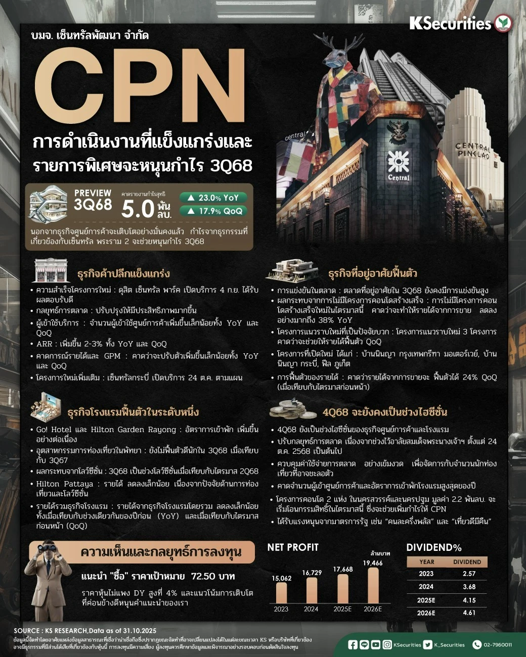 - CPN กำลังปรับกลยุทธ์การตลาดในไตรมาส 4/2568 เนื่องจากประเทศไทยกำลังเข้าสู่ช่วงไว้อาลัยสมเด็จพระนางเจ้าสิริกิติ์ พระบรมราชินีนาถ พระบรมราชชนนีพันปีหลวง ตั้งแต่วันที่ 24 ต.ค.2568 เป็นต้นไป ค่าใช้จ่ายทางการตลาดจะถูกควบคุมอย่างเข้มงวดเพื่อจัดการกับจำนวนนักท่องเที่ยวที่เข้ามาในห้างสรรพสินค้าที่อาจชะลอตัวลง อย่างไรก็ตาม CPN คาดว่าไตรมาส 4/2568 จะยังเป็นไตรมาสที่ดีที่สุดในแง่ของจำนวนผู้เข้ามาเดินในศูนย์การค้าและอัตราการเข้าพักของโรงแรม ทั้งนี้โครงการคอนโด 2 แห่งใน จ.นครสวรรค์และ จ.นครปฐม มูลค่า 2.2 พันลบ. จะเริ่มโอนกรรมสิทธิ์ในไตรมาส 4/2568 ซึ่งจะช่วยเพิ่มกำไรให้กับ CPN ขณะที่ผลการดำเนินงานไตรมาส 4/2568 ของ CPN จะได้รับแรงหนุนจากมาตรการกระตุ้นเศรษฐกิจของรัฐบาลอย่าง “คนละครึ่งพลัส” และ “เที่ยวดีมีคืน”