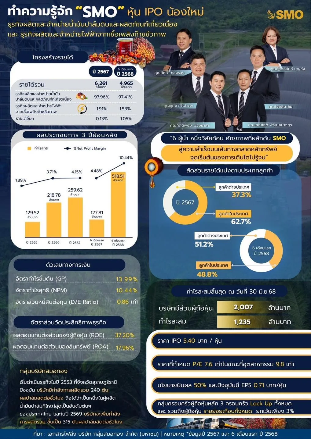 นายสมศักดิ์ ศิริชัยนฤมิตร ประธานเจ้าหน้าที่บริหาร บริษัท แอสเซท โปร แมเนจเม้นท์ จำกัด หรือ APM ในฐานะที่ปรึกษาทางการเงิน เปิดเผยว่า SMO ได้รับการตอบรับที่ดีจากนักลงทุน สะท้อนให้เห็นถึงความน่าสนใจของบริษัทฯ และนักลงทุนรับรู้ถึงปัจจัยพื้นฐานทางธุรกิจที่มีศักยภาพ มีโครงสร้างรายได้ที่มีความมั่นคง และฐานะทางการเงินที่แข็งแกร่ง รวมถึงมีแผนในการขยายธุรกิจที่ชัดเจน สร้างโอกาสในการเติบโตในอนาคต ผลักดันให้สามารถขยายธุรกิจเพื่อเพิ่มศักยภาพ และสร้างโอกาสในการเติบโตให้กับบริษัท โดย SMO ถือเป็นบริษัทที่มีพื้นฐานธุรกิจมั่นคงและแข็งแกร่ง ด้วยความเชี่ยวชาญในอุตสาหกรรมน้ำมันปาล์มครบวงจร โดยเฉพาะด้านโรงงานสกัดน้ำมันปาล์มดิบที่มีประสิทธิภาพสูง ตอกย้ำความเป็นผู้นำในอุตสาหกรรมเกษตรพลังงานของประเทศ อีกทั้งยังโดดเด่นในฐานะ “หุ้นเติบโตสูง (Growth Stock)” ที่มีผลประกอบการขยายตัวต่อเนื่องตลอด 3 ปีที่ผ่านมา สะท้อนศักยภาพในการดำเนินงาน การบริหารจัดการที่มีประสิทธิภาพ และโครงสร้างผู้ถือหุ้นที่แข็งแกร่ง ซึ่งสะท้อนถึงความเชื่อมั่นของทั้งผู้บริหารและนักลงทุนอย่างชัดเจน
