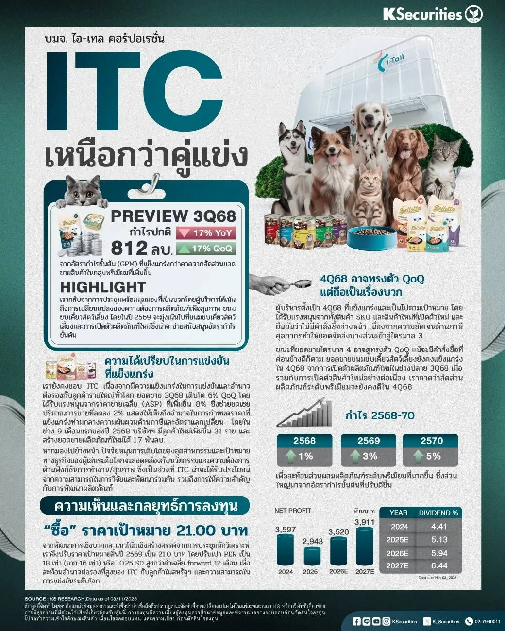 • ITC รายงานกำไรสุทธิไตรมาส 3/2568 ที่ 812 ลบ. (-17% YoY, +17% QoQ) สูงกว่าประมาณการของเราและของตลาด 11% และ 8% ตามลำดับ