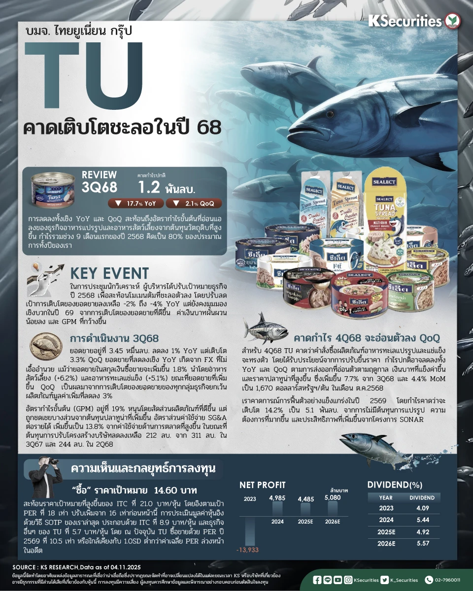 - TU รายงานกำไรไตรมาส 3/68 ที่ 1.3 พันลบ. (-7% YoY, +2.4% QoQ) กำไรปกติอยู่ที่ 1.2 พันลบ. (-17.7% YoY, -2.1% QoQ) สอดคล้องกับประมาณการของเราและตลาด กำไร 9 เดือนแรกของปี 68 คิดเป็น 80% ของประมาณการทั้งปี