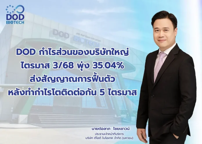 บมจ. ดีโอดี ไบโอเทค หรือ “DOD” โชว์งบไตรมาส 3/2568 มีกำไรสุทธิส่วนของบริษัทใหญ่ 10.02 ล้านบาท เพิ่มขึ้น 35.04% (YoY) ส่งผลให้ 9 เดือนแรก มีกำไร 46.81 ล้านบาท เติบโต 128.63% (YoY) ด้าน CEO “ต่อลาภ ไชยเชาวน์” ตอกย้ำ ผลประกอบการของ DOD ฟื้นตัวอย่างมีนัยสำคัญ เนื่องจาก บริษัทฯ มีกำไรสุทธิ ติดต่อกัน 5 ไตรมาส นับตั้งแต่ไตรมาส 3/2567 จนถึง ไตรมาสปัจจุบัน