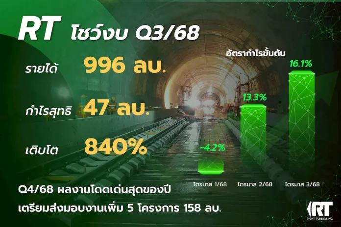 นายชวลิต ถนอมถิ่น ประธานเจ้าหน้าที่บริหาร บริษัท ไร้ท์ทันเน็ลลิ่ง จำกัด (มหาชน) หรือ RT ผู้เชี่ยวชาญพิเศษด้านขุดเจาะอุโมงค์ วิศวกรรมโยธา และ ธรณีเทคนิคครบวงจร เปิดเผยว่า ผลประกอบการไตรมาส 3/68 บริษัทมีรายได้รวม 996 ล้านบาท เพิ่มขึ้นจากช่วงเดียวกันปีก่อนที่มีรายได้รวม 815 ล้านบาท จำนวน 181 ล้านบาท หรือ เพิ่มขึ้น 22% และมีกำไรสุทธิ 47 ล้านบาท เพิ่มขึ้นจากช่วงเดียวกันปีก่อนที่มีกำไรสุทธิ 5 ล้านบาท จำนวน 42 ล้านบาท หรือ เพิ่มขึ้น 840%
