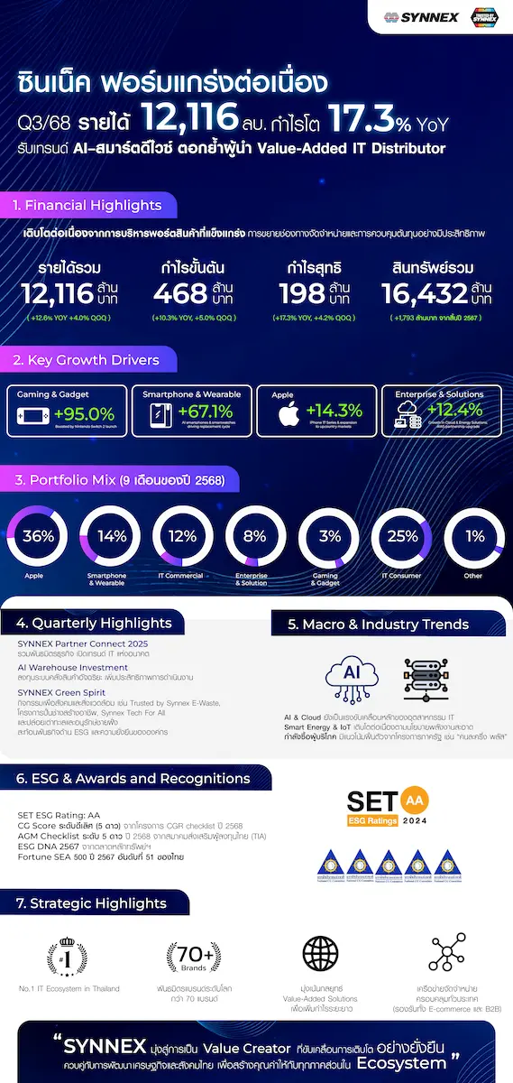 บมจ.ซินเน็ค (ประเทศไทย) หรือ SYNEX โชว์ศักยภาพโตแรง! Q3/68 กำไรพุ่ง 17.3% แตะ 198 ลบ. กวาดรายได้รวม 12,116 ลบ. รับอานิสงส์เทรนด์ AI และ Smart Device ที่ขยายตัวโดดเด่น หนุนกลุ่ม Apple, Smartphone & Wearable โตต่อเนื่อง พร้อมยกระดับความร่วมมือกับ AWS สู่ Advanced Tier Services Partner เสริมพอร์ต Smart Energy Solution และสินค้ามาร์จิ้นสูง ตอกย้ำกลยุทธ์ Value-Added IT Distributor ที่มุ่งสร้างคุณค่าให้กับลูกค้าและพันธมิตรทางธุรกิจ เพื่อการเติบโตอย่างยั่งยืน