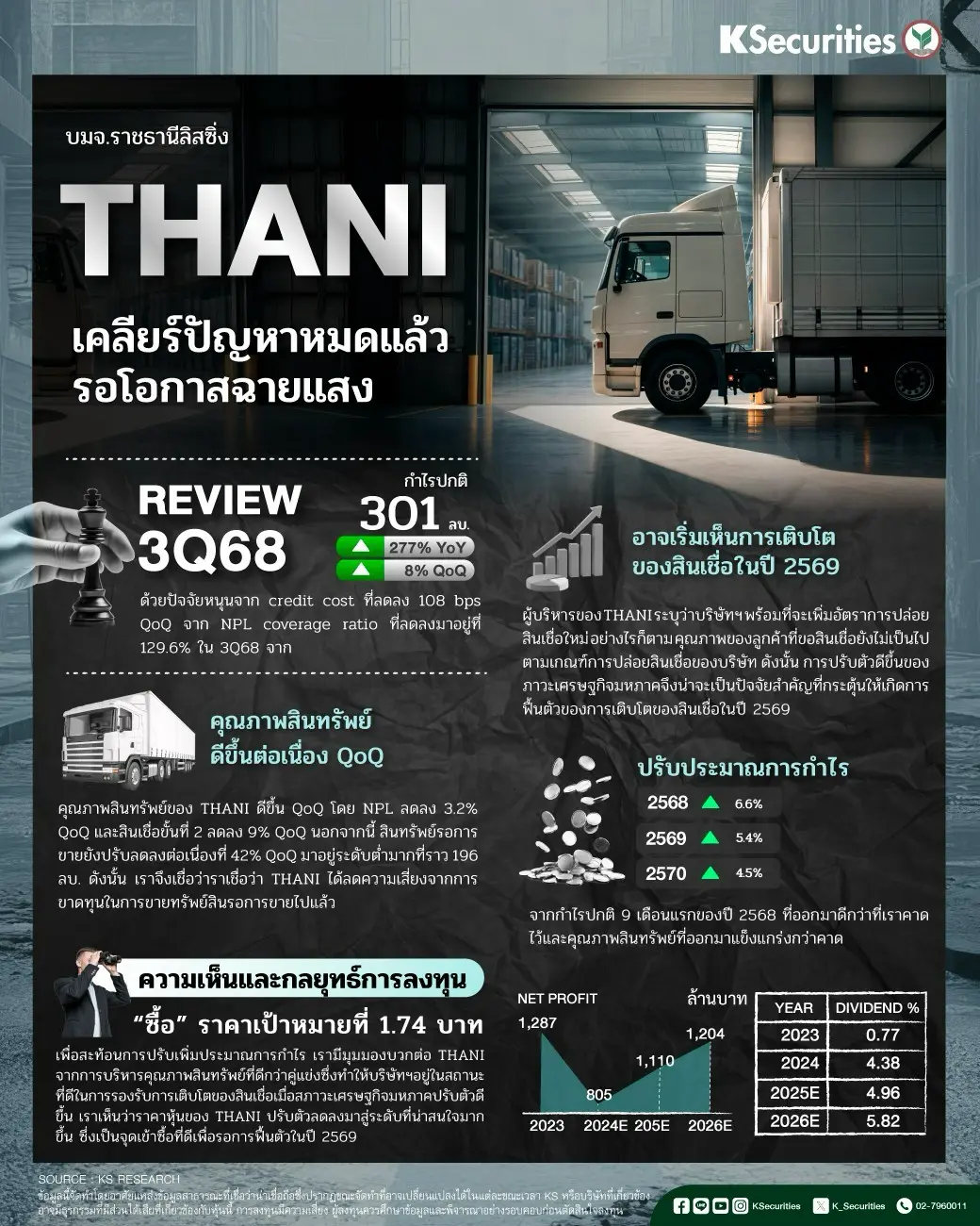 - มุมมอง KS : เพิ่มคำแนะนำเป็น “ซื้อ” และเพิ่ม TP ขึ้นเป็น 1.74 บาท เราเห็นว่าราคาหุ้นของ THANI ปรับตัวลงมาสู่ระดับที่น่าสนใจในการเข้าซื้อเพื่อรับการฟื้นตัวในปี 2569 จากคุณภาพสินทรัพย์ที่แข็งแกร่ง