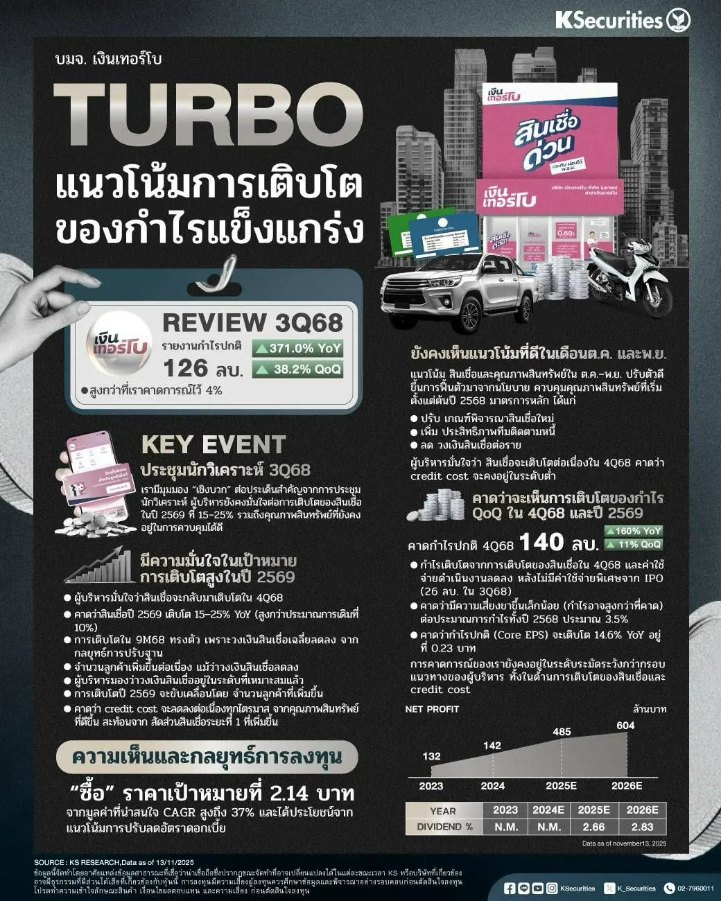 TURBO กำไรปกติ 3Q68 ที่ 126 ลบ. +38.2% QoQ และ +371% YoY มุมมองเชิงบวกต่อประเด็นสำคัญจากการประชุมนักวิเคราะห์ ผู้บริหารยังคงมั่นใจต่อการเติบโตของสินเชื่อในปี 69 ที่ 15–25% รวมถึงคุณภาพสินทรัพย์ที่ยังคงอยู่ในการควบคุมได้ดี