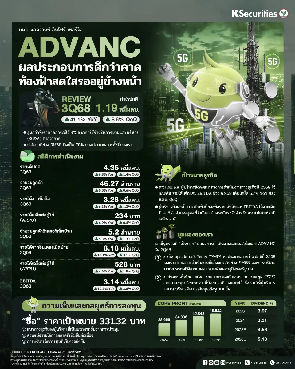 - รีวิวผลประกอบการไตรมาส 3/2568 ADVANC ประกาศงบการเงินไตรมาส 3/2568 โดยมีกำไรสุทธิอยู่ที่ 1.2 หมื่นลบ. หากไม่รวมรายการพิเศษ เช่น กำไรจากอัตราแลกเปลี่ยน (FX) และกำไรจากการขายอุปกรณ์ที่ล้าสมัย กำไรปกติอยู่ที่ 1.19 หมื่นลบ. เพิ่มขึ้น 41.1% YoY จากการเติบโตอย่างแข็งแกร่งของรายได้และการประหยัดต้นทุนด้านกฎระเบียบ และเติบโต 8.6% QoQ จากการควบคุมต้นทุนที่ดีขึ้น กำไรปกติไตรมาส 3/2568 สอดคล้องกับที่เราคาดการณ์ไว้ โดยมีความคลาดเคลื่อน 4% จากค่าใช้จ่ายในการขายและบริหาร (SG&A) ต่ำกว่าคาด ขณะที่กำไรปกติช่วง 9 เดือนแรกของปี 2568 คิดเป็น 78% ของประมาณการทั้งปีของเรา ซึ่งแสดงถึง upside risk เล็กน้อยต่อประมาณการกำไรปกติปี 2568 ของเรา