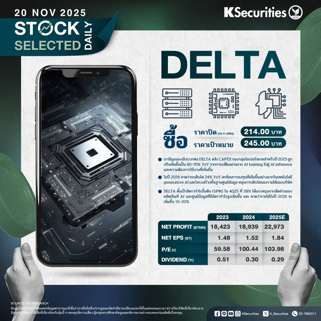 - เรามีมุมมองเชิงบวกต่อ DELTA หลัง CAPEX ของกลุ่มไฮเปอร์สเกลสำหรับปี 2025 ถูกปรับเพิ่มขึ้นเป็น 60–70% YoY จากการเปลี่ยนผ่านจาก AI training ไปสู่ AI inference และความต้องการใช้งานที่เพิ่มขึ้น