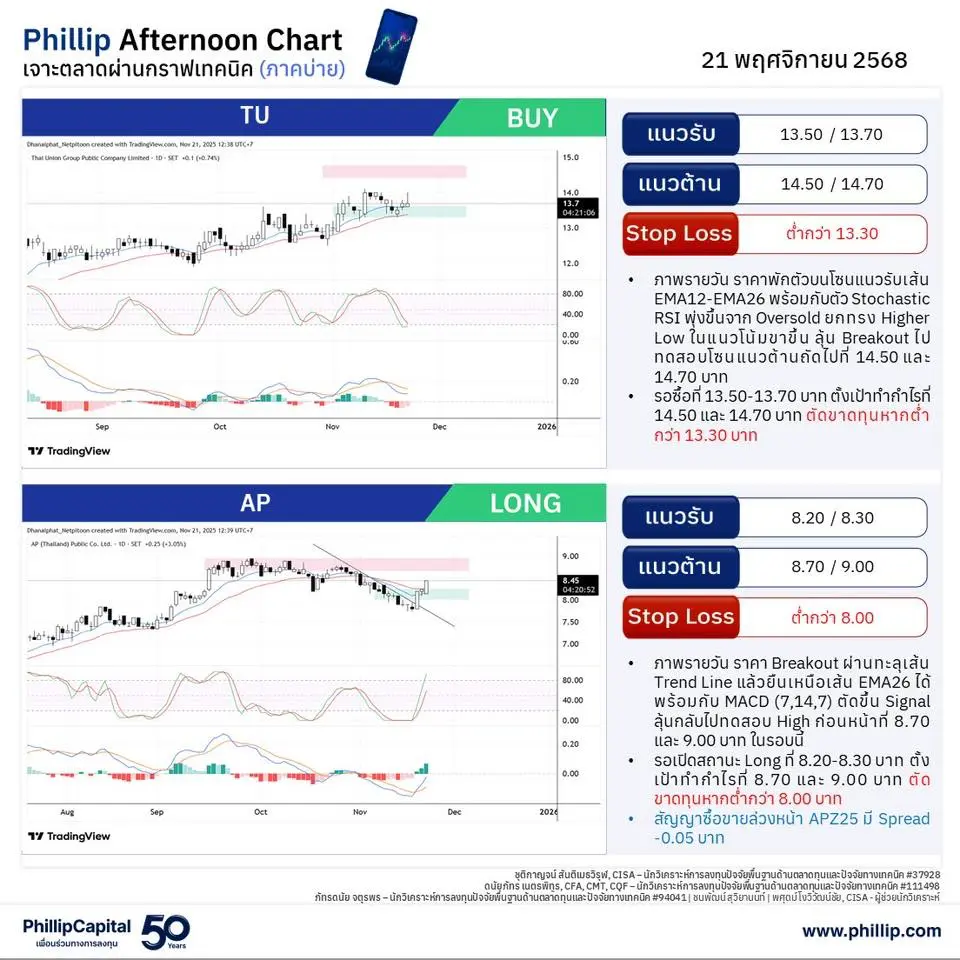 หุ้นแนะนำบ่ายนี้ TU, AP (Long)