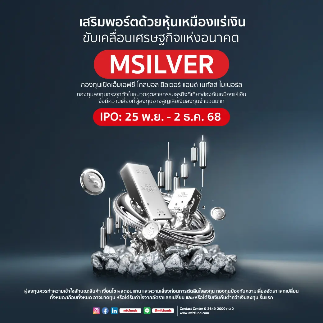 ทั้งนี้ผู้ที่สนใจลงทุน กำหนดเปิดขาย IPO ระหว่างวันที่ 25 พ.ย. – 2 ธ.ค. 2568 ลงทุนขั้นต่ำ 1,000 บาท กองทุนมีระดับความเสี่ยง 7 กองทุน MSILVER ลงทุนกระจุกตัวในหมวดอุตสาหกรรมธุรกิจที่เกี่ยวข้องกับเหมืองแร่เงิน จึงมีความเสี่ยงที่ผู้ลงทุนอาจสูญเสียเงินลงทุนจำนวนมาก ผู้ลงทุนควรทำความเข้าใจลักษณะสินค้า เงื่อนไข ผลตอบแทน และความเสี่ยงก่อนการตัดสินใจลงทุน กองทุนป้องกันความเสี่ยงอัตราแลกเปลี่ยนทั้งหมด/เกือบทั้งหมด อาจขาดทุนหรือได้รับกำไรจากอัตราแลกเปลี่ยน และ/หรือได้รับเงินคืนต่ำกว่าเงินลงทุนครั้งแรก สอบถามข้อมูลและขอรับหนังสือชี้ชวนได้ที่ บลจ.เอ็มเอฟซี จำกัด (มหาชน) และตัวแทนสนับสนุนการขาย หรือ โทรศัพท์ 0-2649-2000 ติดต่อฝ่ายวางแผนการลงทุน กด 2 หรือ Contact Center กด 0 สาขาแจ้งวัฒนะ โทร. 0-2835-3055-57 สาขาปิ่นเกล้า โทร. 0-2014-3150-2 สาขาขอนแก่น โทร. 043-204-014-16 สาขาเชียงใหม่ โทร.0-5321-8480-82 สาขาระยอง โทร. 033-100-340 สาขาหาดใหญ่ โทร. 074-232-324-25 หรือที่ www.mfcfund.com