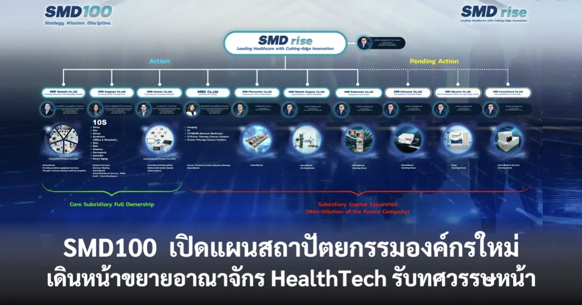 บริษัท เอสเอ็มดี ไรส์ จำกัด (มหาชน) หรือ SMD100 ประกาศกรอบสถาปัตยกรรมองค์กร Dual-Engine Architecture ต่อผู้ถือหุ้น นักลงทุน คู่ค้า พันธมิตรเชิงกลยุทธ์ หน่วยงานภาครัฐ ภาคการแพทย์ และผู้มีส่วนได้ส่วนเสียทุกภาคส่วน เพื่อรองรับการเติบโตของอุตสาหกรรมสุขภาพในศตวรรษที่ 21 ชูจุดเด่น มั่นคง–รวดเร็ว–ยืดหยุ่น ในการขยายธุรกิจ พร้อมวางรากฐานสู่ยุทธศาสตร์ HealthTech แบบยั่งยืนทั้งในและต่างประเทศ