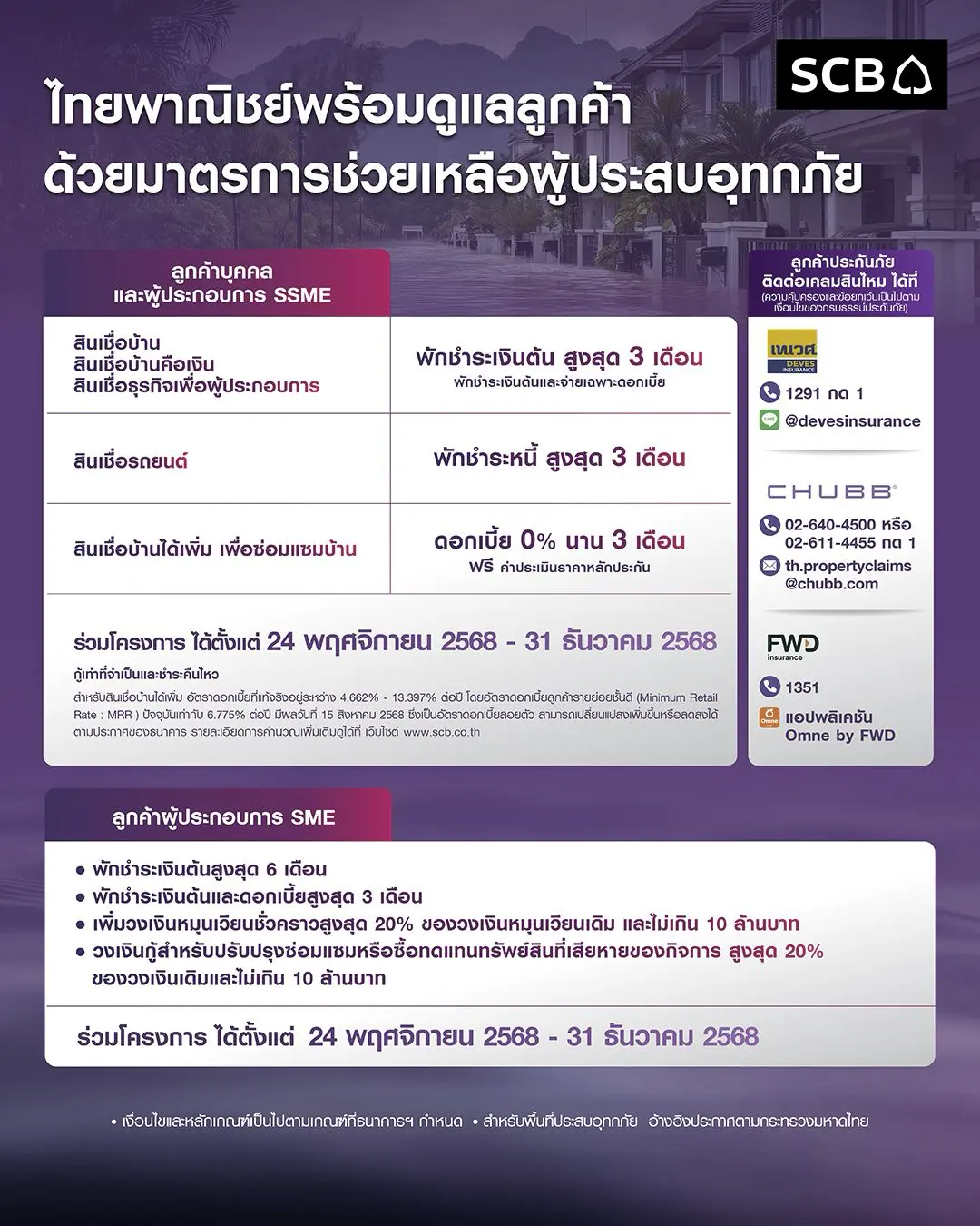ธนาคารไทยพาณิชย์ขอส่งกำลังใจไปยังพี่น้องประชาชนในพื้นที่ที่ประสบอุทกภัยภาคใต้ พร้อมดำเนินการให้ความช่วยเหลือลูกค้าอย่างเต็มความสามารถ เพื่อให้สามารถก้าวผ่านวิกฤตครั้งนี้ไปได้ ทั้งนี้ ธนาคารจะเร่งดำเนินการพิจารณาคำร้องของลูกค้าที่ได้รับผลกระทบอย่างรอบคอบและทันท่วงที เพื่อให้ลูกค้าที่ได้รับผลกระทบกลับมาดำเนินชีวิตได้ตามปกติโดยเร็วที่สุด
