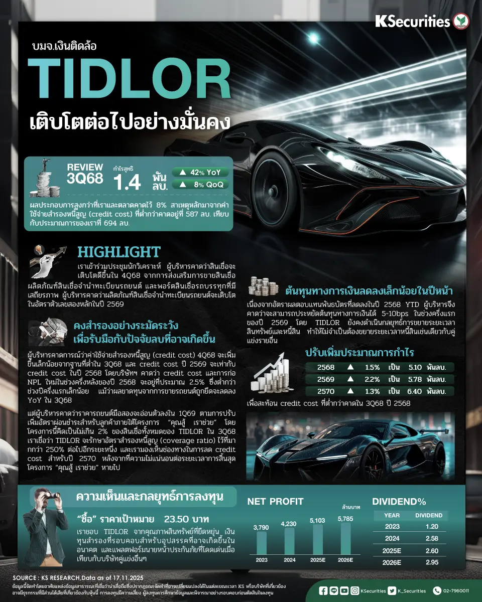 - คงสำรองอย่างระมัดระวังเพื่อรับมือกับปัจจัยลบที่อาจเกิดขึ้น ผู้บริหารคาดการณ์ว่าค่าใช้จ่ายสำรองหนี้สูญ (credit cost) ไตรมาส 4/2568 จะเพิ่มขึ้นเล็กน้อยจากฐานที่ต่ำในไตรมาส 3/2568 และ credit cost ปี 2569 จะเท่ากับ credit cost ในปี 2568 โดยบริษัทฯ คาดว่า credit cost และการก่อ NPL ใหม่ในช่วงครึ่งหลังของปี 2568 จะอยู่ที่ประมาณ 2.5% ซึ่งต่ำกว่าช่วงปีครึ่งแรกเล็กน้อย แม้ว่าผลขาดทุนจากการขายรถยนต์ถูกยึดจะลดลง YoY ในไตรมาส 3/2568 แต่ผู้บริหารคาดว่าราคารถยนต์มือสองจะอ่อนตัวลงในไตรมาส 1/2568 ตามการปรับเพิ่มอัตราผ่อนชำระสำหรับลูกค้าภายใต้โครงการ “คุณสู้ เราช่วย” โดยโครงการนี้คิดเป็นไม่เกิน 2% ของสินเชื่อทั้งหมดของ TIDLOR ในไตรมาส 3/2568 เราเชื่อว่า TIDLOR จะรักษาอัตราสำรองหนี้สูญ (coverage ratio) ไว้ที่มากกว่า 250% ต่อไปอีกระยะหนึ่ง และเรามองเห็นช่องทางในการลด credit cost สำหรับปี 2570 หลังจากที่ความไม่แน่นอนต่อระยะเวลาการสิ้นสุดโครงการ “คุณสู้ เราช่วย” หายไป