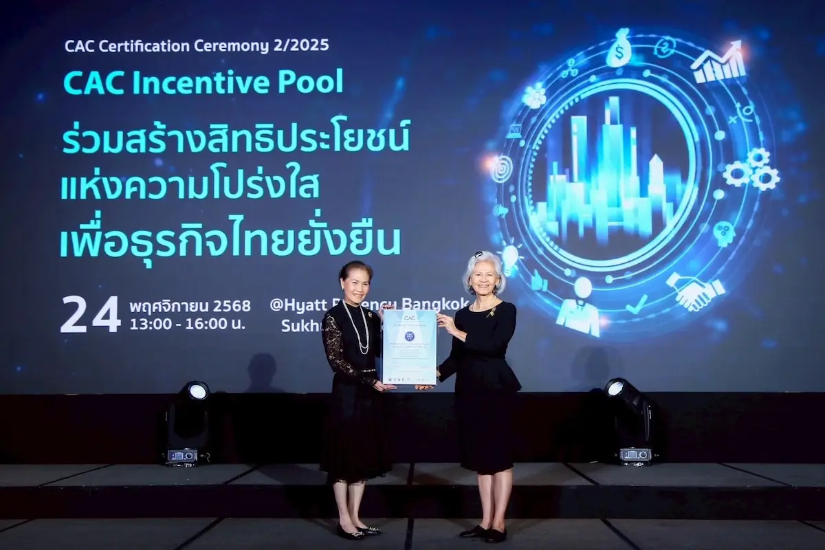 ในการนี้ นางจินตณา กิ่งแก้ว รองกรรมการผู้จัดการ เป็นผู้แทนบริษัทเข้ารับมอบประกาศนียบัตรจาก นางอรนุช อภิศักดิ์ศิริกุล (CAC Council) คณะกรรมการแนวร่วมต่อต้านการคอร์รัปชันของภาคเอกชนไทย ณ โรงแรมไฮแอท รีเจนซี่ กรุงเทพฯ เมื่อวันที่ 24 พฤศจิกายน 2568