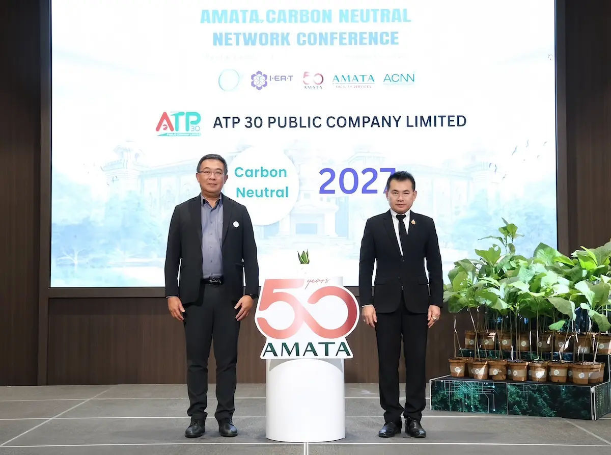 นายปิยะเตชากูล (ซ้าย) ประธานเจ้าหน้าที่บริหารบริษัทเอทีพี 30 จำกัด (มหาชน) (ATP30) เข้าร่วมพิธีประกาศเจตนารมณ์เครือข่าย Amata Carbon Neutral Network (ACNN) พร้อมรับมอบต้นไม้จากนายพงศ์ธสิษฐ์ปิจนันท์ (ขวา) รองผู้ว่าราชการจังหวัดชลบุรีแสดงถึงความร่วมมือของภาคอุตสาหกรรมไทยในการขับเคลื่อนเมืองอุตสาหกรรมสู่ความยั่งยืนและลดการปล่อยก๊าซเรือนกระจกอย่างเป็นรูปธรรมภายในงานมีเวทีแลกเปลี่ยนองค์ความรู้ด้าน Clean Energy, Green Energy และ Smart Technology เพื่อเสริมศักยภาพภาคอุตสาหกรรมไทยในการก้าวสู่เป้าหมาย Carbon Neutrality และ Net Zero ณโรงแรมนิกโก้อมตะซิตี้ชลบุรีเมื่อเร็วๆนี้