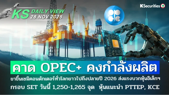 KS Daily View 28 พ.ย. 2025>>>คาด SET Index จะแกว่งตัว sideway up ในกรอบ 1,250 – 1,265 จุด จากปัจจัยเชิงบวกของต่างประเทศ หลังมีรายงานว่า OPEC+ มีแนวโน้มจะคงระดับการผลิตน้ำมันไว้ตามเดิมในการประชุมวันอาทิตย์นี้ แนะนำ PTTEP และ KCE