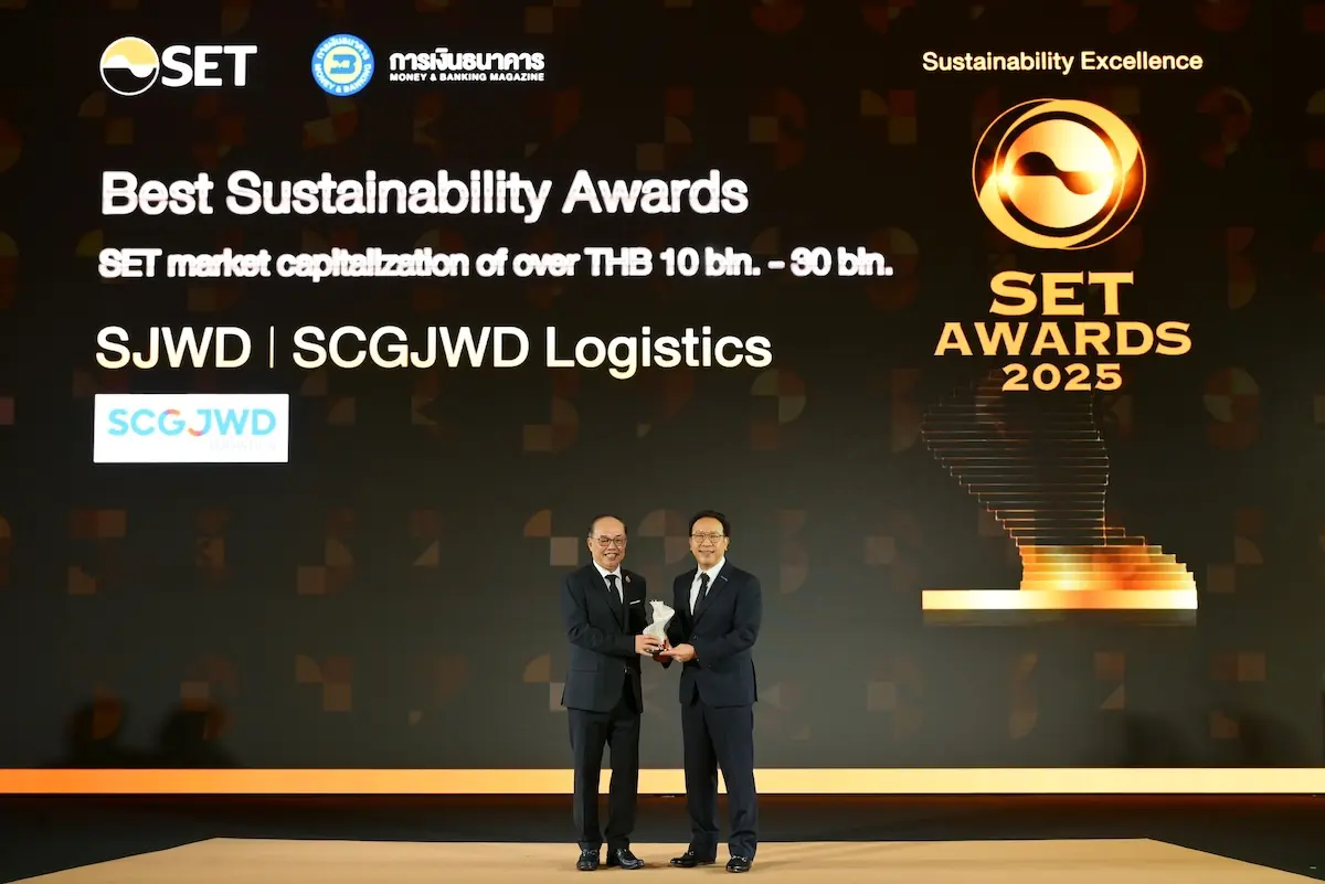นายชวนินทร์ บัณฑิตกฤษดา (ขวา) ประธานเจ้าหน้าที่บริหารร่วม บริษัท เอสซีจี เจดับเบิ้ลยูดี โลจิสติกส์ จำกัด (มหาชน) หรือ SJWD ผู้ให้บริการโลจิสติกส์และซัพพลายเชนแบบครบวงจรรายใหญ่ที่สุดในอาเซียน รับรางวัล Best Sustainability Awards กลุ่มรางวัล Sustainability Excellence ในกลุ่มบริษัทจดทะเบียนที่มีมูลค่าหลักทรัพย์ตามราคาตลาด สูงกว่า 10,000 ล้านบาท แต่ไม่เกิน 30,000 ล้านบาท จากงาน SET Awards 2025 จาก ศาสตราจารย์พิเศษ กิติพงศ์ อรุพีพัฒนพงศ์ (ซ้าย) ประธานกรรมการ ตลาดหลักทรัพย์แห่งประเทศไทย ซึ่งมอบให้กับบริษัทจดทะเบียนที่มีความโดดเด่นด้านการดำเนินธุรกิจอย่างยั่งยืน มีการกำกับดูแลกิจการที่ดี คำนึงถึงผู้มีส่วนได้ส่วนเสียอย่างรอบด้าน สร้างผลการดำเนินงานเติบโตพร้อมกับมีส่วนร่วมสร้างผลกระทบเชิงบวกต่อสังคมและสิ่งแวดล้อม โดย SJWD มีโนยบายดำเนินธุรกิจตามแนวทางการพัฒนาความยั่งยืนครอบคลุมทั้ง 3 มิติ ได้แก่ (1) สิ่งแวดล้อม มุ่งเน้นการใช้ทรัพยากรให้เกิดประโยชน์สูงสุดและรักษาสมดุลของระบบนิเวศอย่างยั่งยืน (2) สังคม ดูแลพนักงานอย่างเป็นธรรมและเท่าเทียม มีความรับผิดชอบต่อสังคม และมีส่วนร่วมกับทุกภาคส่วนเพื่อดูแลชุมชนและสังคม และ (3) ธรรมาภิบาลและเศรษฐกิจ มุ่งเน้นการกำกับดูแลกิจการที่ดี สนับสนุนผู้มีส่วนได้ส่วนเสียตลอดห่วงโซ่คุณค่าเพื่อมุ่งสู่เป้าหมาย Green logistics โดยงานดังกล่าวจัดโดยตลาดหลักทรัพย์แห่งประเทศไทยร่วมกับวารสารการเงินธนาคาร เมื่อเร็ว ๆ นี้