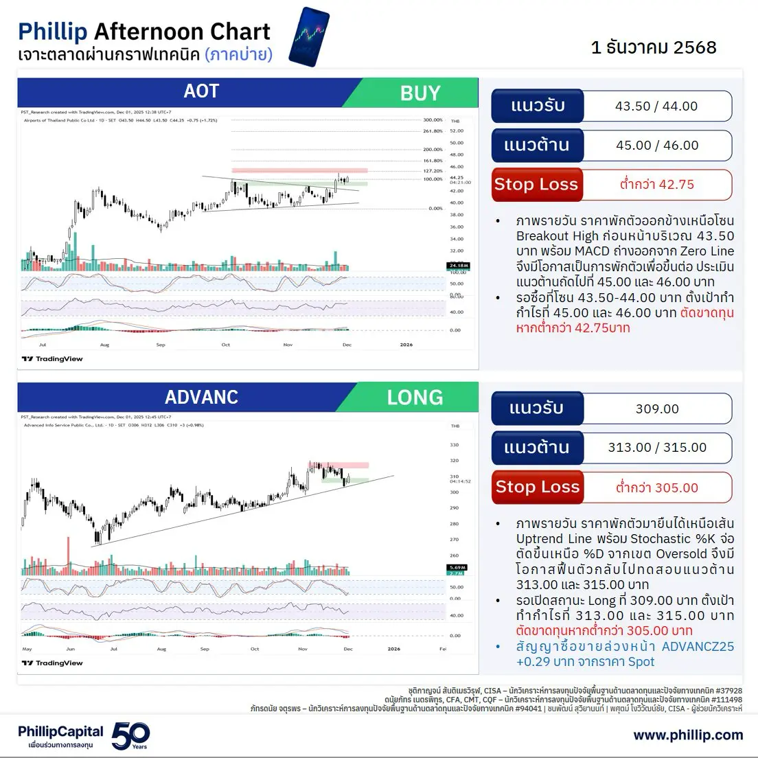 หุ้นแนะนำบ่ายนี้ AOT, ADVANC (Long)