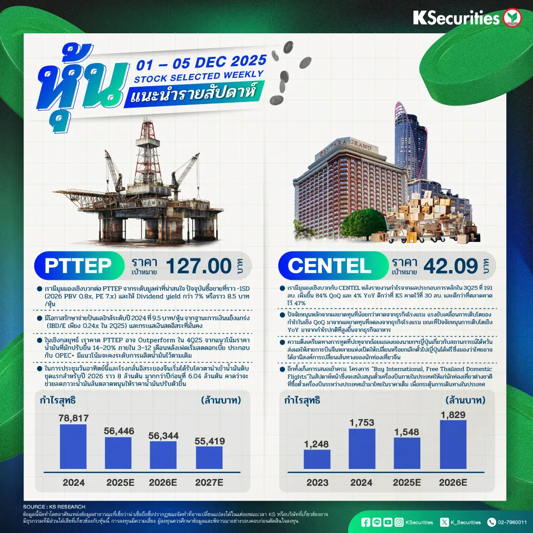 - เรามีมุมองเชิงบวกกับ CENTEL หลังรายงานกำไรจากผลประกอบการหลักใน 3Q25 ที่ 191 ลบ. เพิ่มขึ้น 84% QoQ และ 4% YoY ดีกว่าที่ KS คาดไว้ที่ 30 ลบ. และดีกว่าที่ตลาดคาดไว้ 47%