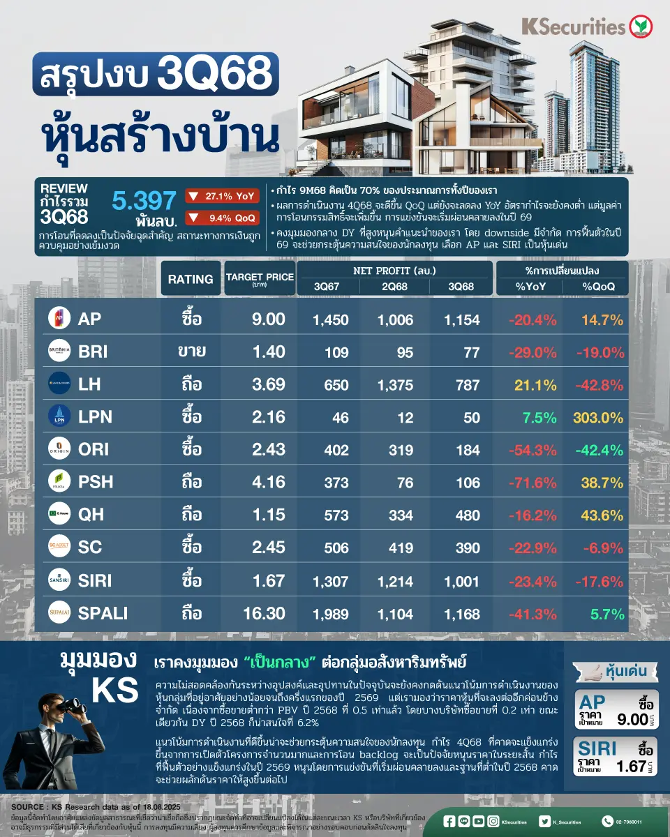 หุ้นสร้างบ้าน Residential Sector การโอนที่ลดลงทำให้กำไร 3Q68 อ่อนตัว