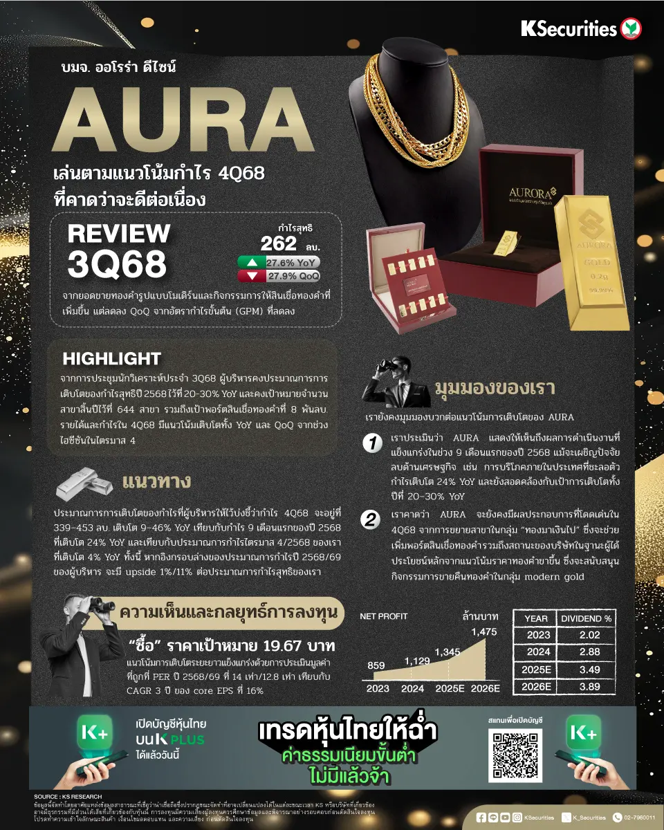 • มุมมองของเรา เรายังคงมุมมองบวกต่อแนวโน้มการเติบโตของ AURA ประการแรก เราประเมินว่า AURA แสดงให้เห็นถึงผลการดำเนินงานที่แข็งแกร่งในช่วง 9 เดือนแรกของปี 2568 แม้จะเผชิญปัจจัยลบด้านเศรษฐกิจ เช่น การบริโภคภายในประเทศที่ชะลอตัว กำไรเติบโต 24% YoY และยังสอดคล้องกับเป้าการเติบโตทั้งปีที่ 20–30% YoY ประการที่สอง เราคาดว่า AURA จะยังคงมีผลประกอบการที่โดดเด่นในไตรมาส 4/2568 จากการขยายสาขาในกลุ่ม “ทองมาเงินไป” ซึ่งจะช่วยเพิ่มพอร์ตสินเชื่อทองคำ รวมถึงสถานะของบริษัทในฐานะผู้ได้ประโยชน์หลักจากแนวโน้มราคาทองคำขาขึ้น ซึ่งจะสนับสนุนกิจกรรมการขายคืนทองคำในกลุ่ม modern gold