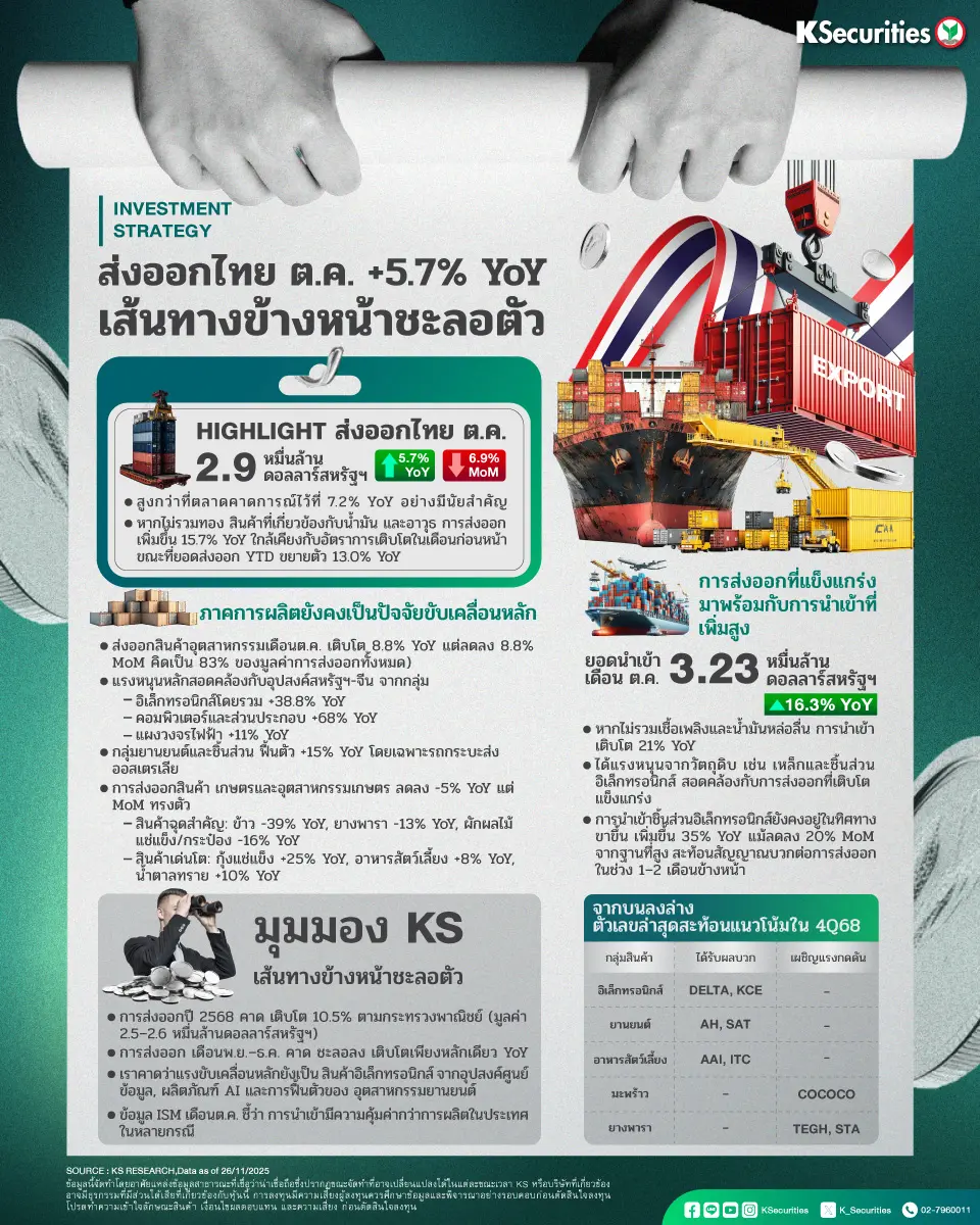 - ภาคการผลิตยังเป็นแรงขับเคลื่อนหลัก การส่งออกสินค้าอุตสาหกรรมเติบโต 8.8% YoY แต่ลดลง 8.8% MoM ในเดือนต.ค. คิดเป็น 83% ของมูลค่าการส่งออกทั้งหมด โดยได้รับแรงหนุนหลักจากกลุ่มอิเล็กทรอนิกส์ที่เติบโต 38.8% คอมพิวเตอร์และส่วนประกอบเติบโต 68% YoY และแผงวงจรไฟฟ้าเติบโต 11% YoY สอดคล้องกับอุปสงค์ที่แข็งแกร่งจากสหรัฐฯ และจีนท่ามกลางวัฏจักรขาขึ้นของอุตสาหกรรมอิเล็กทรอนิกส์ ปัจจัยสำคัญอื่น ๆ ได้แก่ กลุ่มยานยนต์และชิ้นส่วนที่ฟื้นตัว 15% YoY โดยเฉพาะรถกระบะในออสเตรเลีย ขณะที่การส่งออกสินค้าเกษตรและอุตสาหกรรมเกษตรยังเป็นแรงกดดัน โดยลดลง 5% YoY แต่ทรงตัว MoM สินค้าที่เป็นแรงฉุดสำคัญ ได้แก่ ข้าว (-39% YoY) ยางพารา (-13% YoY) และผักผลไม้แช่แข็งและกระป๋อง (-16% YoY) ในทางตรงกันข้าม การส่งออกกุ้งแช่แข็ง (+25% YoY) อาหารสัตว์เลี้ยง (+8% YoY) และน้ำตาลทราย (+10% YoY) เติบโตแข็งแกร่งในเดือนดังกล่าว