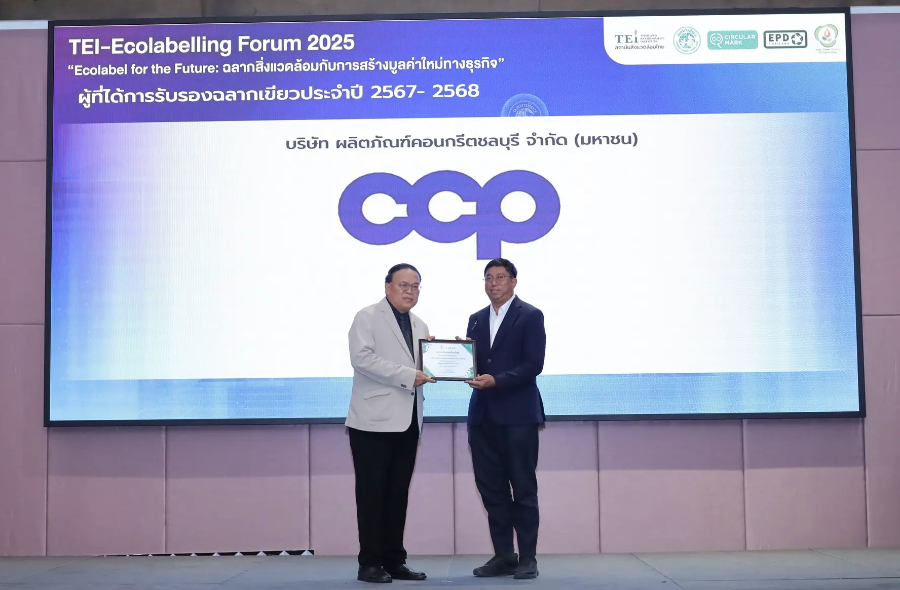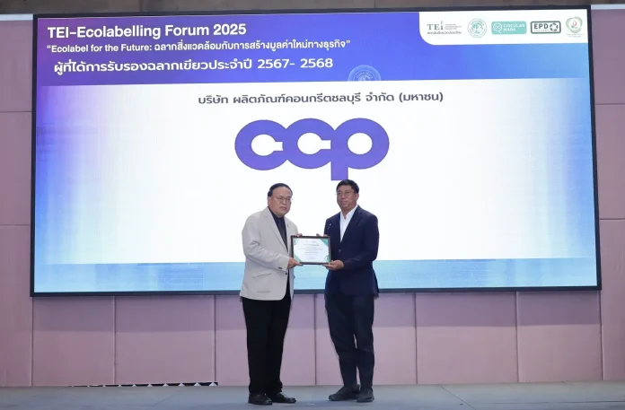 นายณราแสงสง่าศรีกรรมการบริษัท (ขวา) เป็นตัวแทนบริษัทผลิตภัณฑ์คอนกรีตชลบุรีจำกัด (มหาชน) หรือ CCP รับเกียรติบัตรการรับรองฉลากเขียวประจำปี 2567 – 2568 โดยได้รับเกียรติจากดร.วิจารย์ สิมาฉายา (ซ้าย) ผู้อำนวยการสถาบันสิ่งแวดล้อมไทย ซึ่ง CCP ถือเป็นหนึ่งใน 70 บริษัท ที่ได้รับเกียรติบัตรรับรองฉลากสิ่งแวดล้อมกับการสร้างมูลค่าใหม่ทางธุรกิจ ตอกย้ำการมุ่งมั่นการพัฒนากระบวนการผลิตที่ปลอดภัยต่อสิ่งแวดล้อม ณ โรงแรม ทีเค พาเลซ แอนด์ คอนเวนชั่น กรุงเทพฯ เมื่อวันที่ 11 พฤศจิกายน 2568 ที่ผ่านมา
