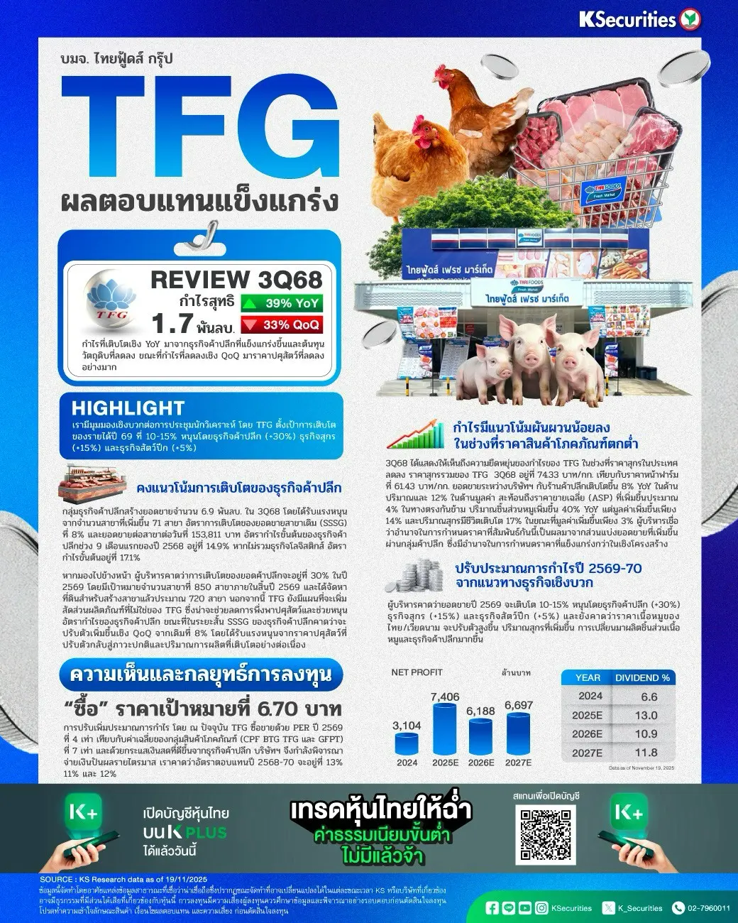 มุมมอง KS : เราคงคำแนะนำ “ซื้อ” แต่ปรับเพิ่มราคาเป้าหมายเป็น 6.70 บาท การปรับเพิ่มประมาณการกำไร โดย ณ ปัจจุบัน TFG ซื้อขายด้วย PER ปี 2569 ที่ 4 เท่า เทียบกับค่าเฉลี่ยของกลุ่มสินค้าโภคภัณฑ์ (CPF BTG TFG และ GFPT) ที่ 7 เท่า และด้วยกระแสเงินสดที่ดีขึ้นจากธุรกิจค้าปลีก บริษัทฯ จึงกำลังพิจารณาจ่ายเงินปันผลรายไตรมาส เราคาดว่าอัตราตอบแทนปี 2568-70 จะอยู่ที่ 13% 11% และ 12%