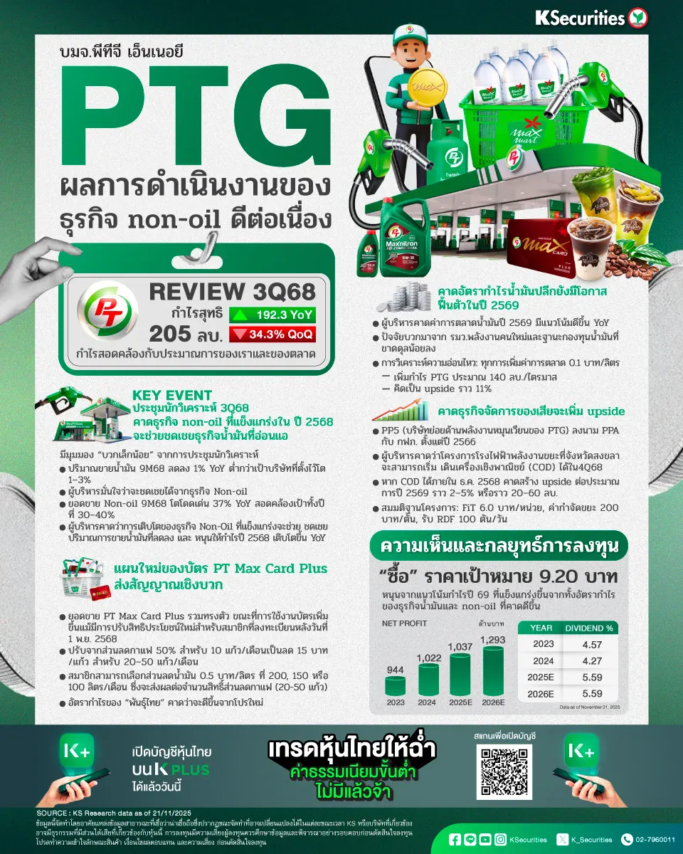 - เราเข้าร่วมการประชุมนักวิเคราะห์ประจำไตรมาส 3/2568 กับ PTG เมื่อวันที่ 20 พ.ย.2568 โดยโทนการประชุมโดยรวมค่อนข้างอยู่ในเชิงบวก แม้ปริมาณการขายน้ำมัน 9 เดือนแรกปีนี้ลดลง 1% YoY น้อยกว่าเป้าการเติบโตในปี 2568 ที่บริษัทฯ ตั้งไว้ที่ 1-3% YoY แต่ผู้บริหารคาดว่าปัจจัยลบดังกล่าวจะถูกชดเชยด้วยยอดขายของธุรกิจที่ไม่ใช่น้ำมันที่แข็งแกร่งขึ้น โดยยอดขายของธุรกิจที่ไม่ใช่น้ำมันเติบโตขึ้น 37% YoY ช่วง 9 เดือนแรกปีนี้ สอดคล้องกับเป้าหมายปี 2568 ที่ตั้งไว้ที่ 30-40% YoY ซึ่งคาดจะช่วยหนุนกำไรปี 2568 ให้เติบโตขึ้น YoY