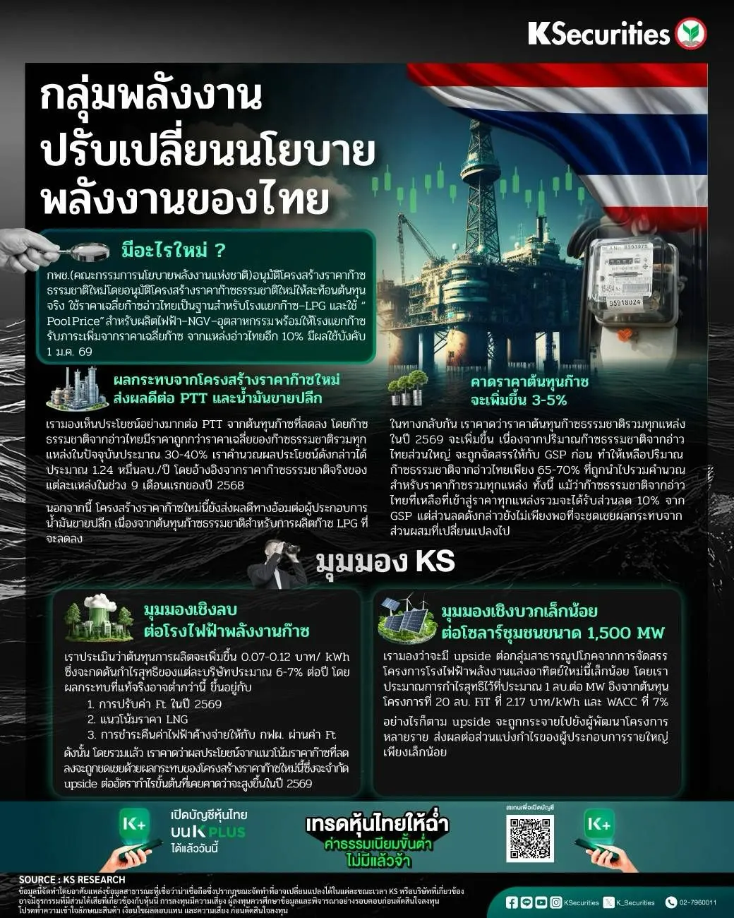 - มุมมองเชิงลบต่อโรงไฟฟ้าพลังงานก๊าซ เรามองว่าโครงสร้างก๊าซที่ปรับปรุงใหม่เป็นลบต่อโรงไฟฟ้า SPP โดยเฉพาะที่มีกลไกค่าไฟฟ้าที่เชื่อมโยงกับค่า Ft อย่าง GPSC และ BGRIM ทั้งนี้ เราประเมินว่าต้นทุนการผลิตจะเพิ่มขึ้น 0.07-0.12 บาท/ kWh ซึ่งจะกดดันกำไรสุทธิของแต่ละบริษัทประมาณ 6-7% ต่อปี โดยผลกระทบที่แท้จริงอาจต่ำกว่านี้ ขึ้นอยู่กับ 1) การปรับค่า Ft ในปี 2569 2) แนวโน้มราคา LNG และ 3) การชำระคืนค่าไฟฟ้าค้างจ่ายให้กับการไฟฟ้าฝ่ายผลิตแห่งประเทศไทย (กฟผ.) ผ่านค่า Ft ดังนั้น โดยรวมแล้ว เราคาดว่าผลประโยชน์จากแนวโน้มราคาก๊าซที่ลดลงจะถูกชดเชยด้วยผลกระทบของโครงสร้างราคาก๊าซใหม่นี้ ซึ่งจะจำกัด upside ต่ออัตรากำไรขั้นต้นที่เคยคาดว่าจะสูงขึ้นในปี 2569 อย่างไรก็ตาม หากรัฐบาลยังคงอัตราค่าไฟฟ้าไว้ที่ 3.94 บาท/ kWh หรือปรับเพิ่มขึ้นเพื่อสะท้อนต้นทุนที่สูงขึ้นนี้ ผลกระทบจากสูตรราคาใหม่น่าจะมีอยู่อย่างจำกัด
