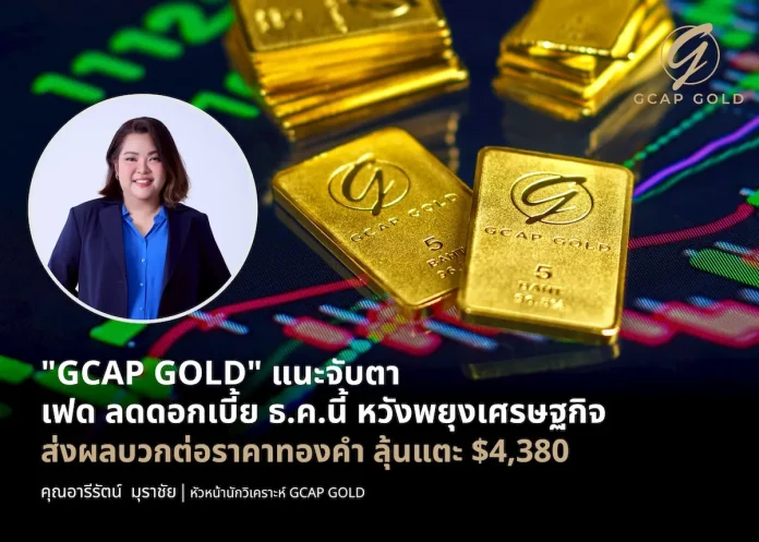 GCAP GOLD แนะจับตา เฟด ลดดอกเบี้ย ธ.ค.นี้ หวังพยุงเศรษฐกิจ ส่งผลบวกต่อราคาทองคำ ลุ้นแตะ $4,380