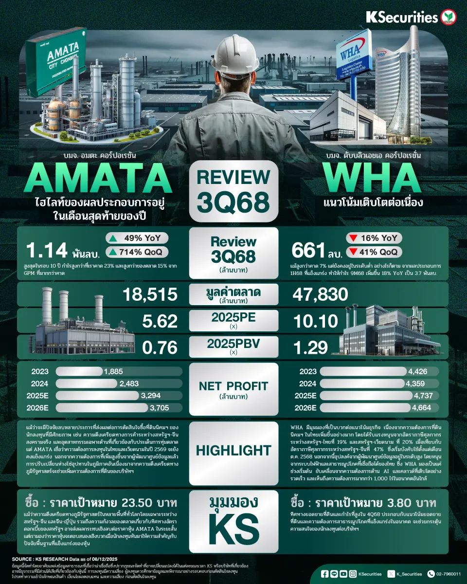 - แนะ “ซื้อ” WHA และราคาเป้าหมายกลางปี 2569 ที่ 3.8 บาท ทิศทางยอดขายที่ดินและกำไรที่สูงในไตรมาส 4/2568 ประกอบกับแนวโน้มยอดขายที่ดินและความต้องการสาธารณูปโภคที่แข็งแกร่งในอนาคต จะช่วยกระตุ้นความสนใจของนักลงทุนต่อบริษัทฯ