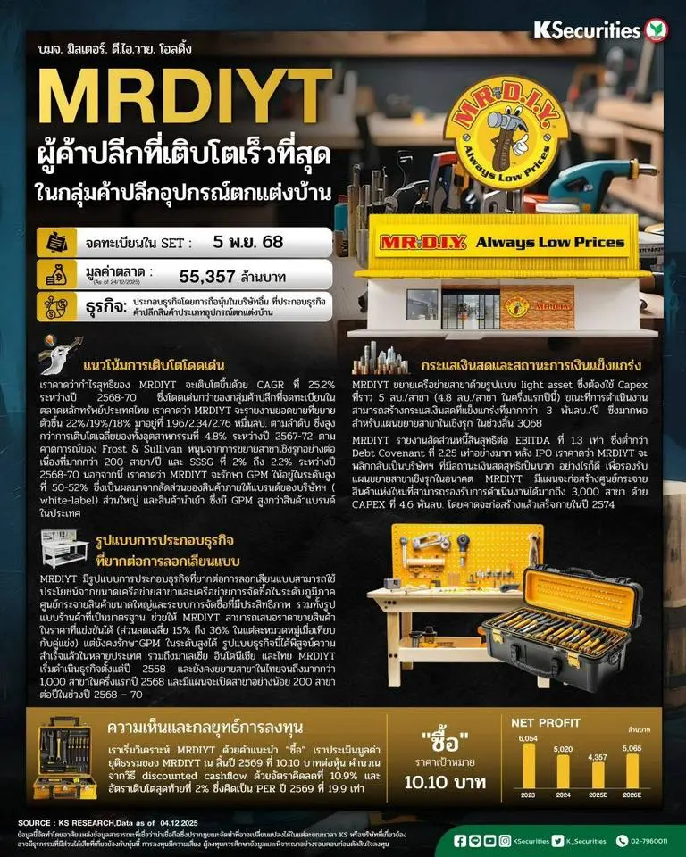 MRDIYT ผู้ค้าปลีกที่เติบโตเร็วที่สุดในกลุ่มค้าปลีกอุปกรณ์ตกแต่งบ้าน แนวโน้มการเติบโตโดดเด่น รูปแบบธุรกิจยากต่อการลอกเลียนแบบ กระแสเงินสดและสถานะการเงินแข็งแกร่ง