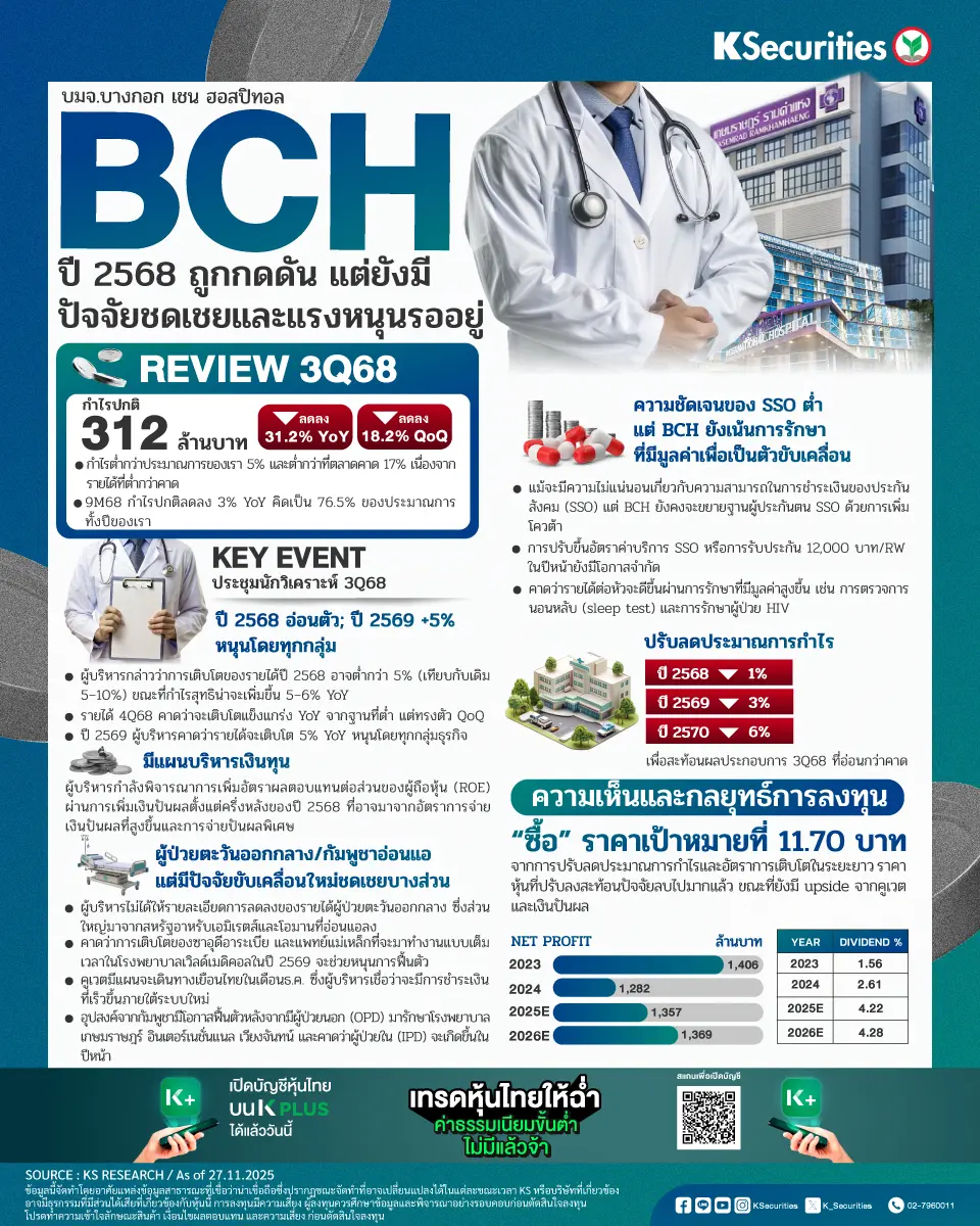 - แนะ “ซื้อ” แม้เป้าหมายการเติบโตของรายได้ 5% ในปี 2569 จะค่อนข้างท้าทาย แต่เราเชื่อว่า BCH จะยังมีอัตราการเติบโตกำไรเป็นบวกแม้อยู่ในภาวะเศรษฐกิจอ่อนแอ ราคาหุ้นที่ปรับลง 11% น่าจะสะท้อนผลประกอบการไตรมาส 3/2568 ที่อ่อนแอ และความกังวลต่อแนวโน้มรายได้ผู้ป่วยต่างชาติและ SSO แล้ว ราคาปัจจุบันเทรด PER 18 เท่า ซึ่งเป็นระดับที่น่าสนใจลงทุน มีโอกาสปรับเพิ่มประมาณการจากการฟื้นตัวของคูเวตและการบริหารทุนในปีหน้า ซึ่งเรายังไม่รวมในประมาณการ ความเสี่ยงขาลงคือ เศรษฐกิจที่อ่อนแอกว่าคาดและความสามารถในการบริหารต้นทุนลดลง